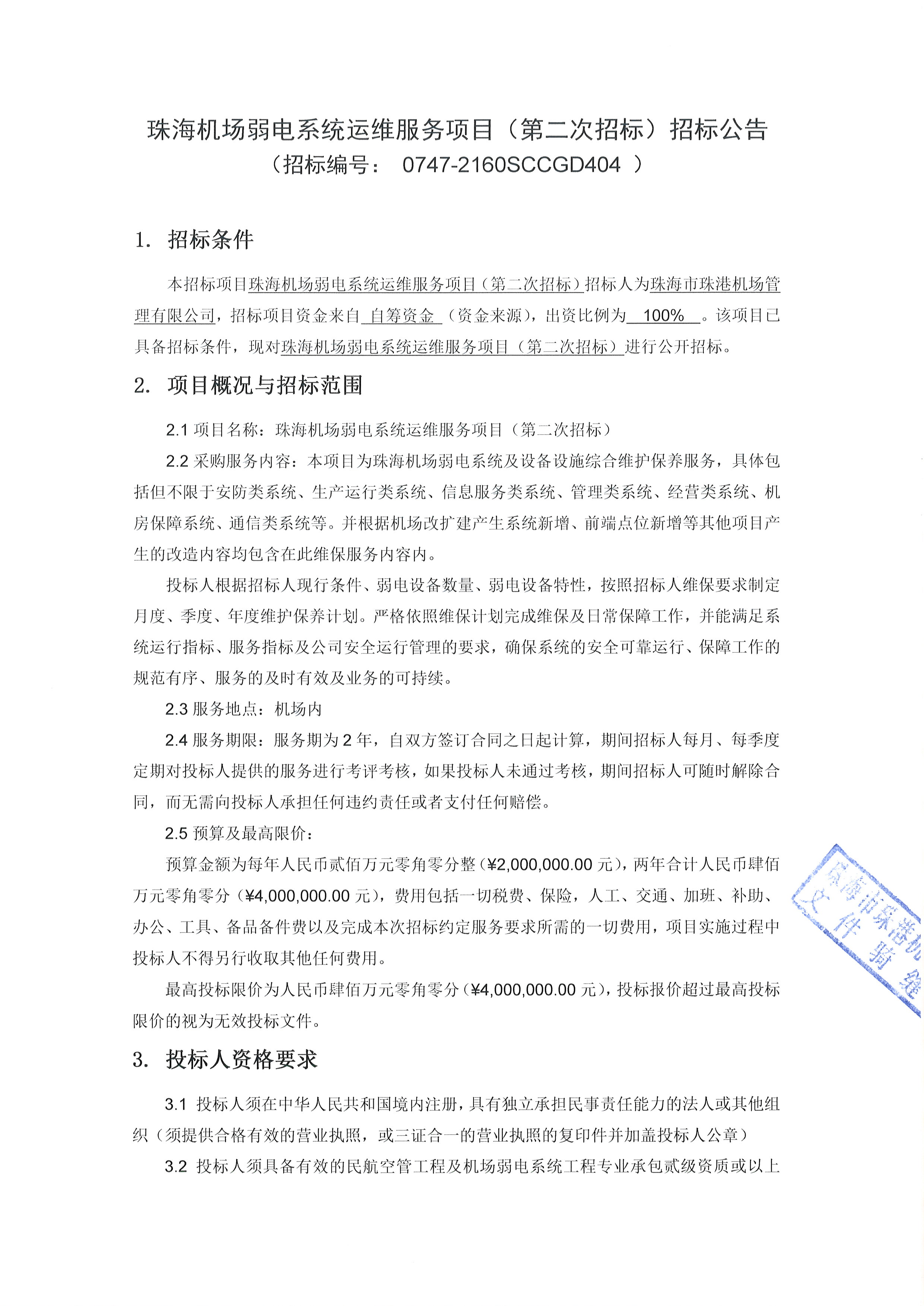珠海机场弱电系统运维服务项目(第二次招标)招标公告