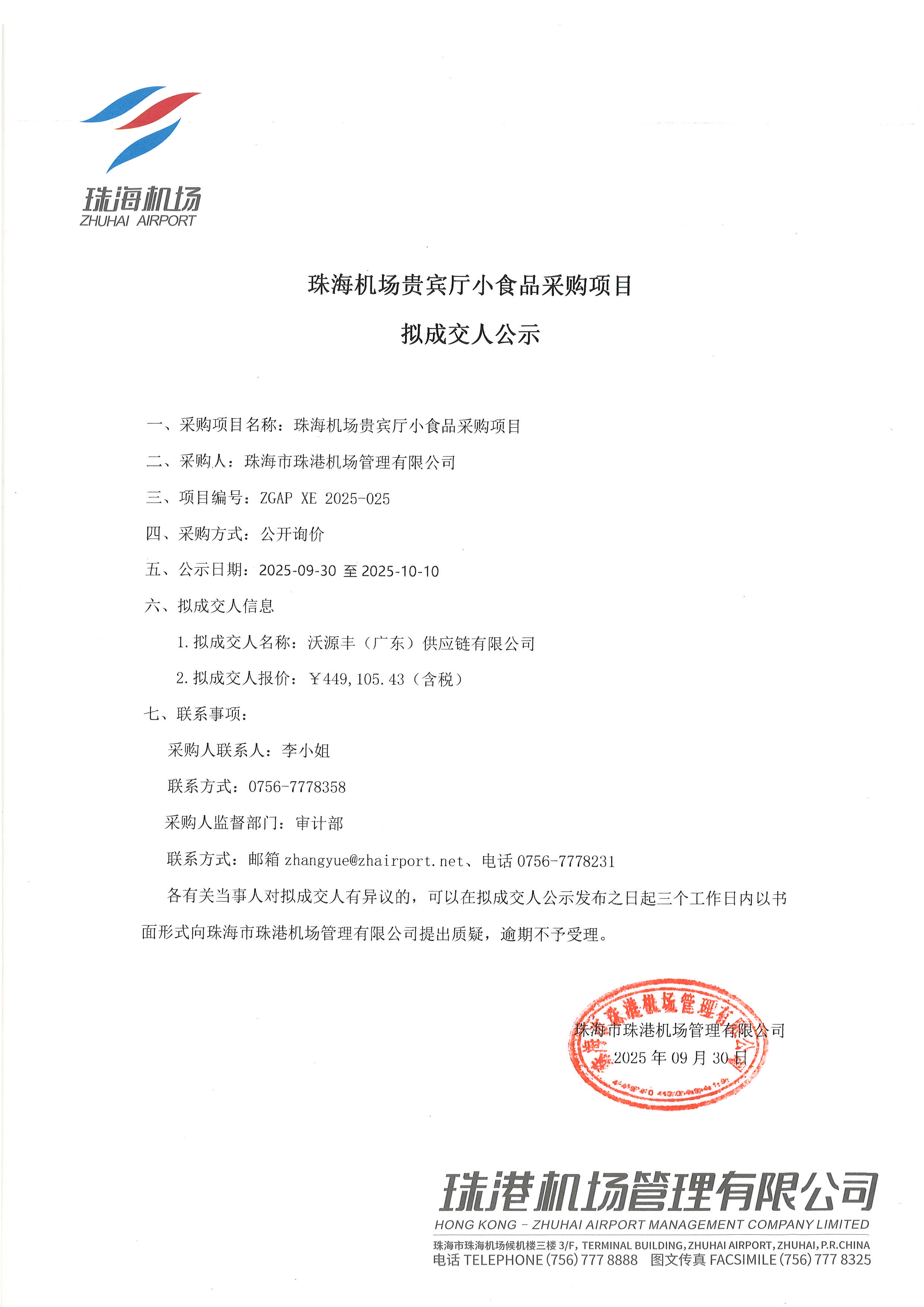 珠海机场贵宾厅小食品采购项目拟成交人公示