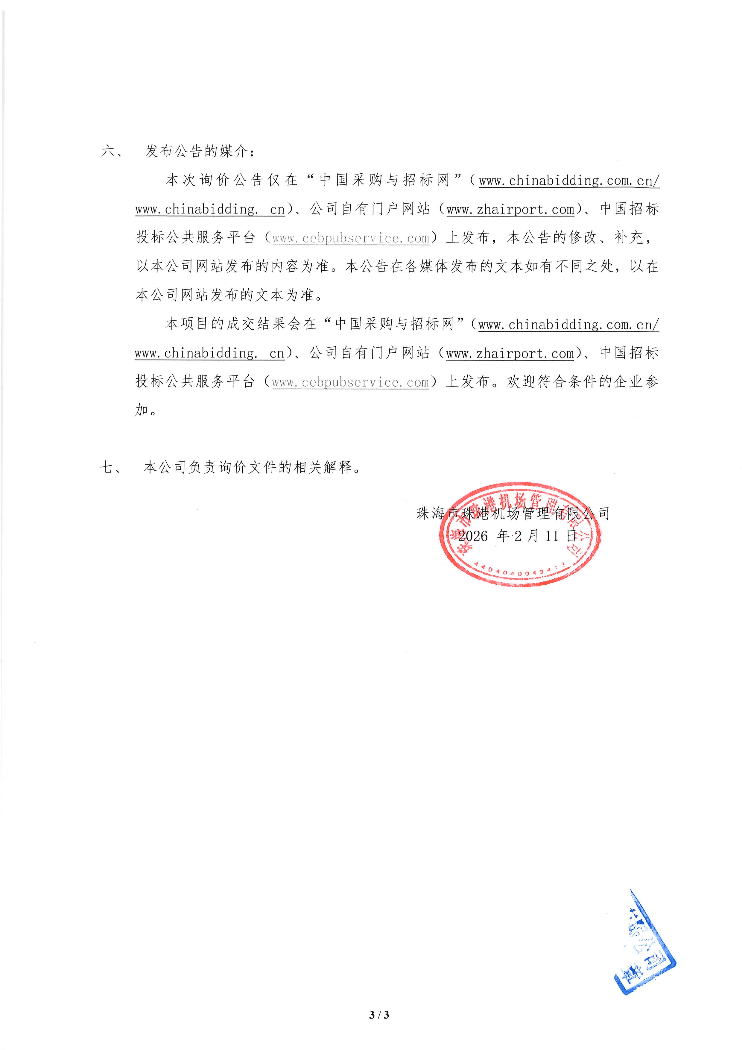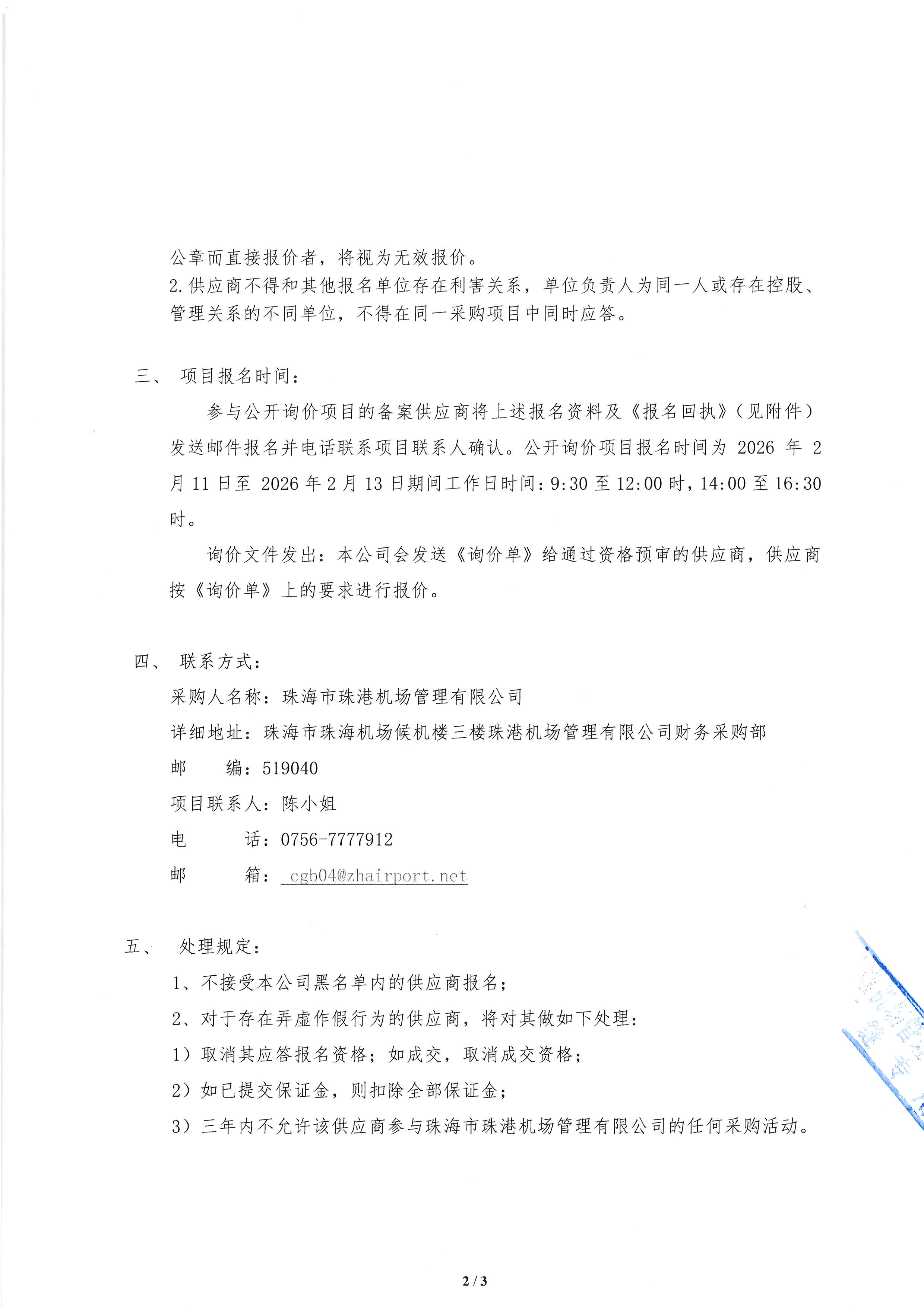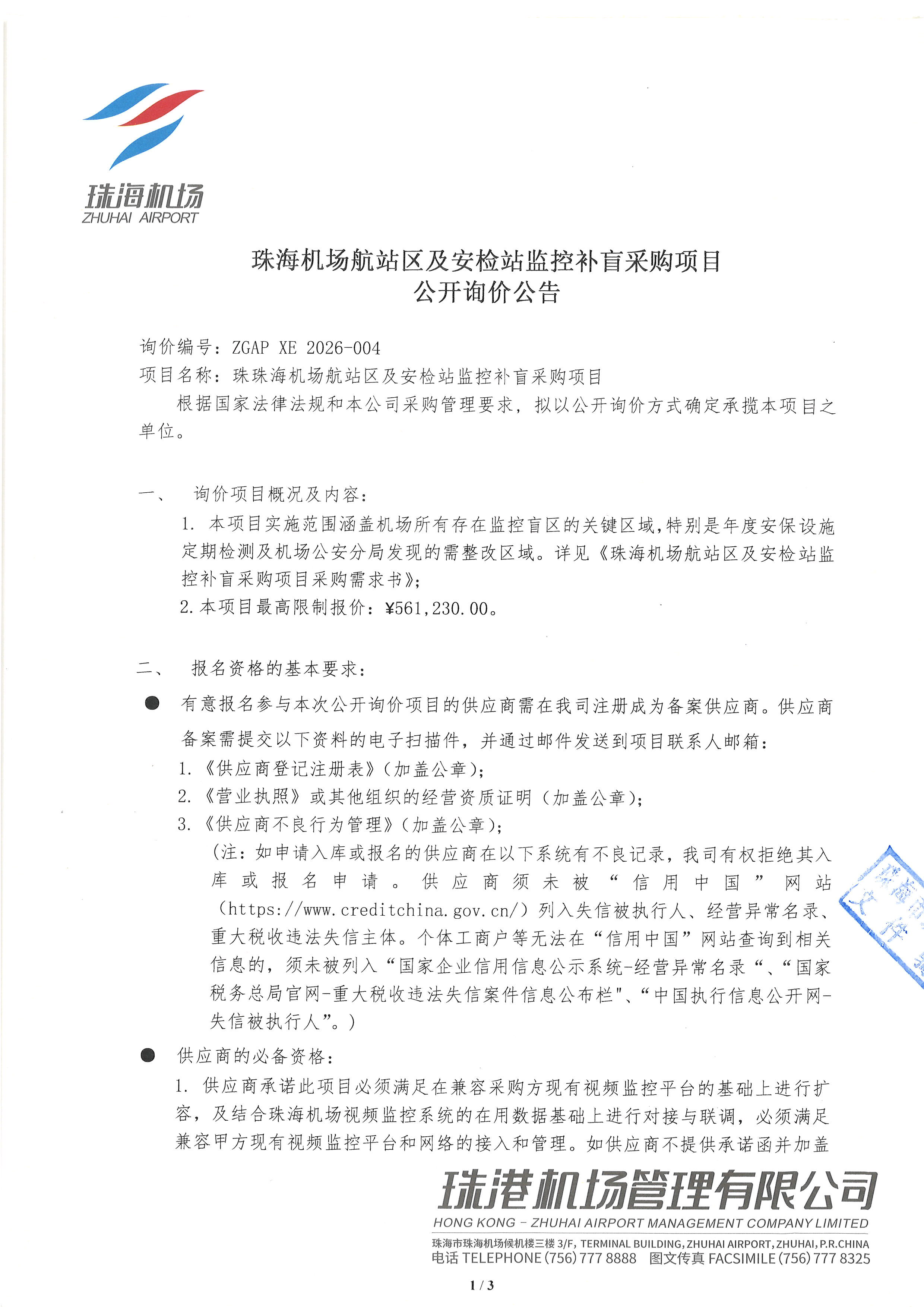 珠海机场航站区及安检站监控补盲采购项目 公开询价公告