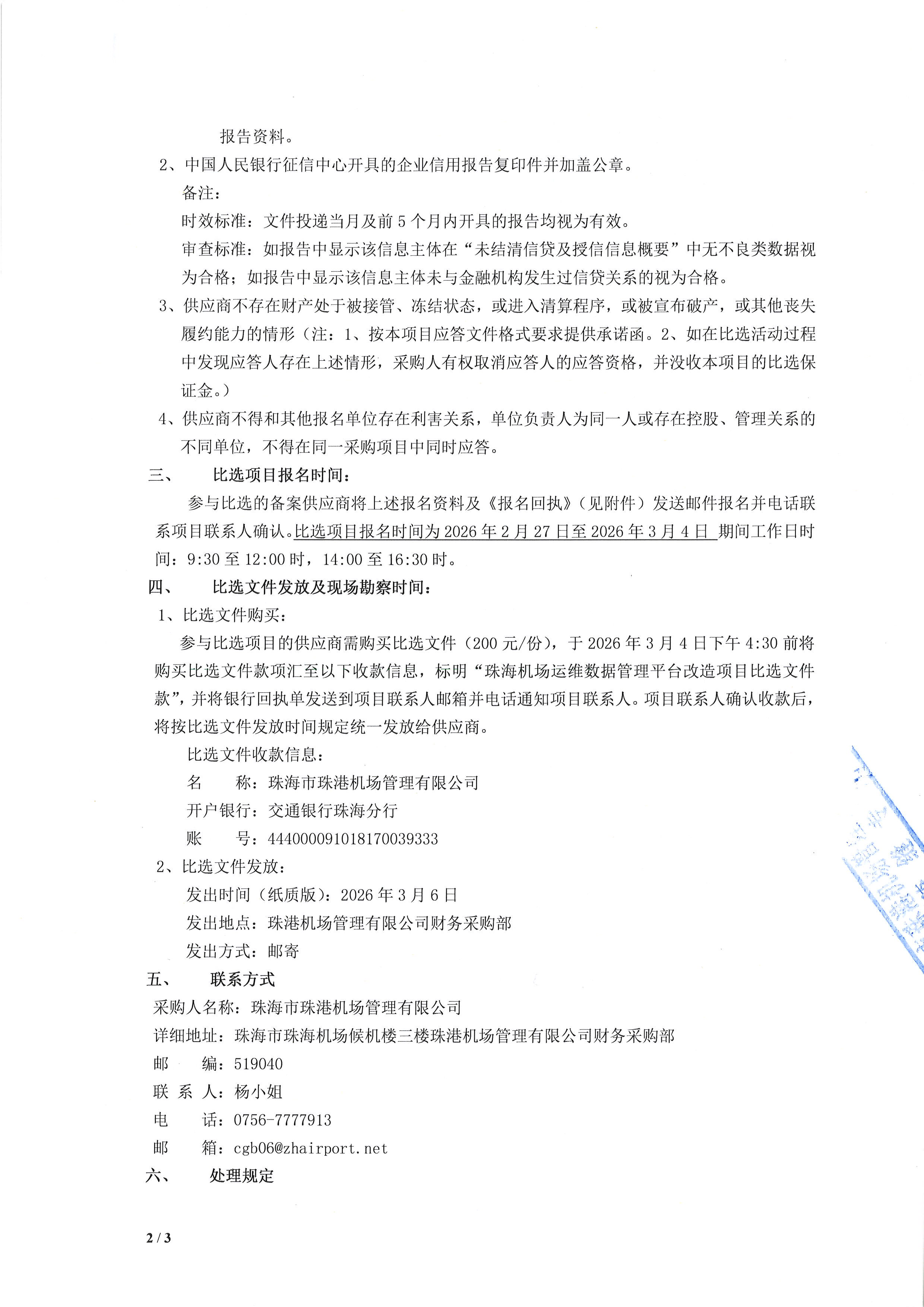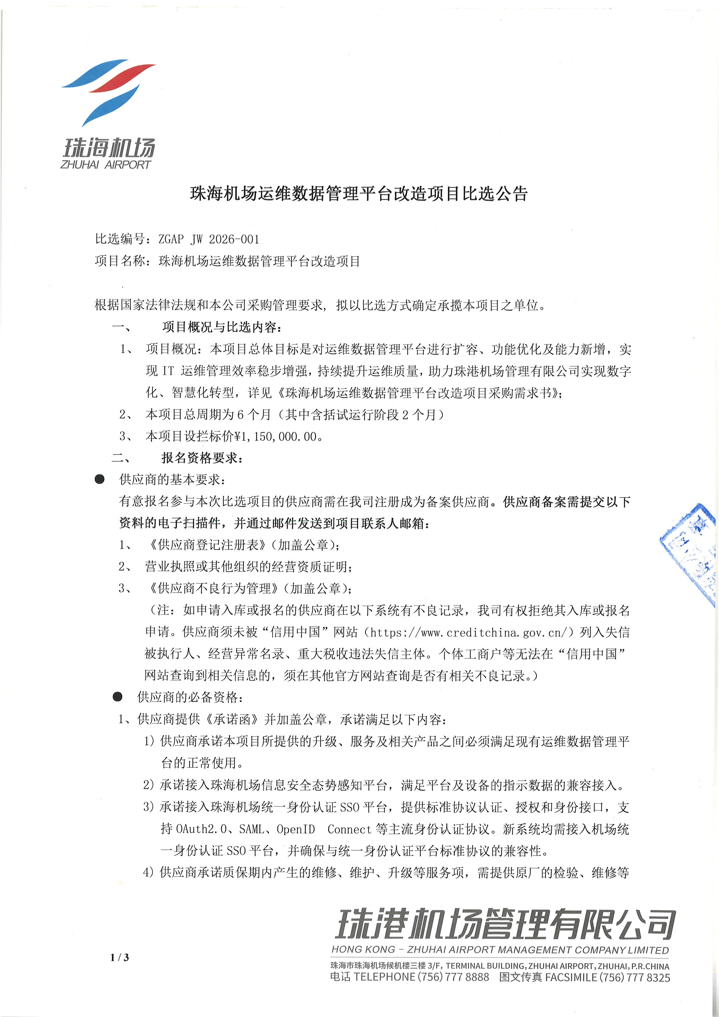 珠海机场运维数据管理平台改造项目比选公告
