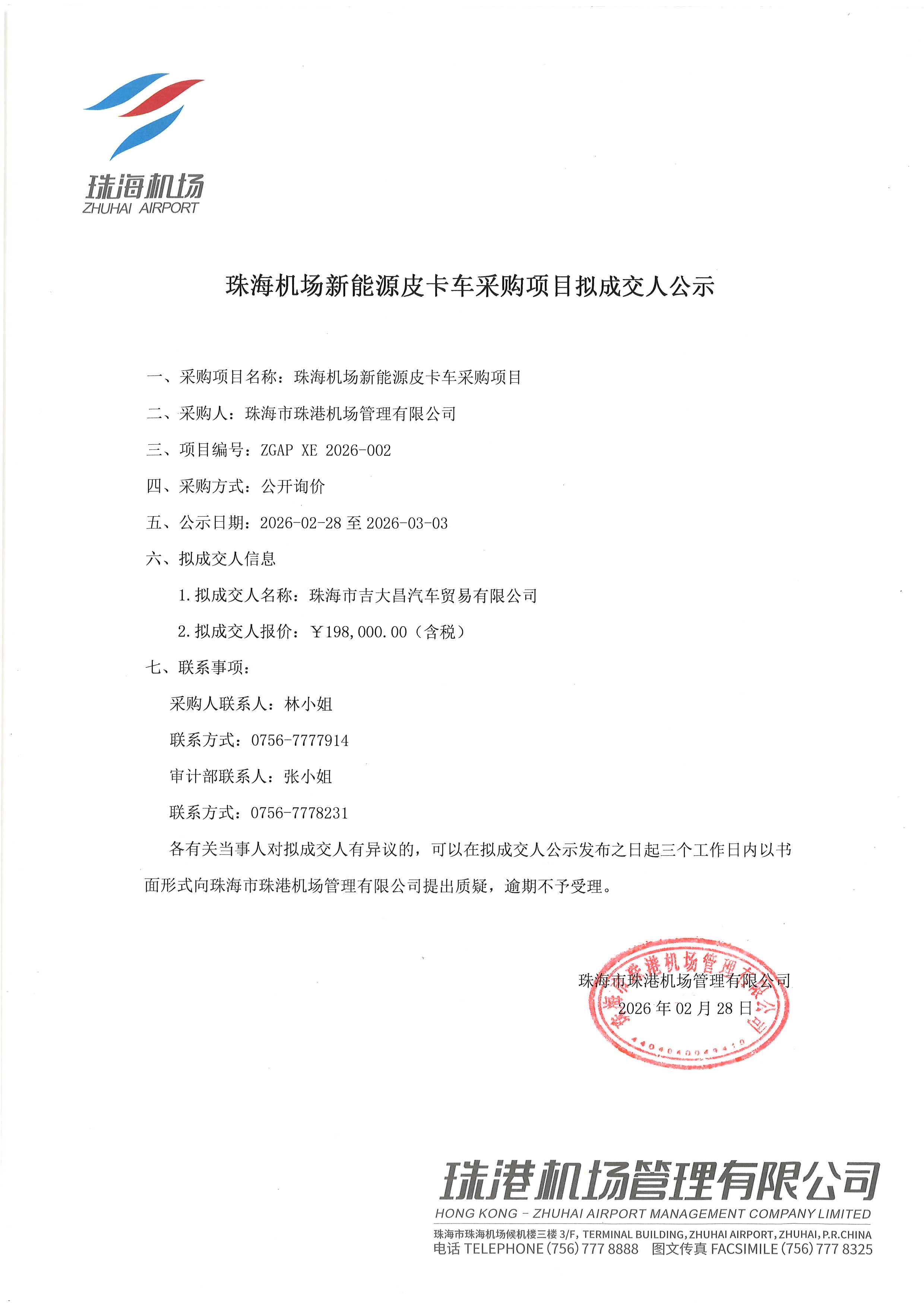 珠海机场新能源皮卡车采购项目拟成交人公示