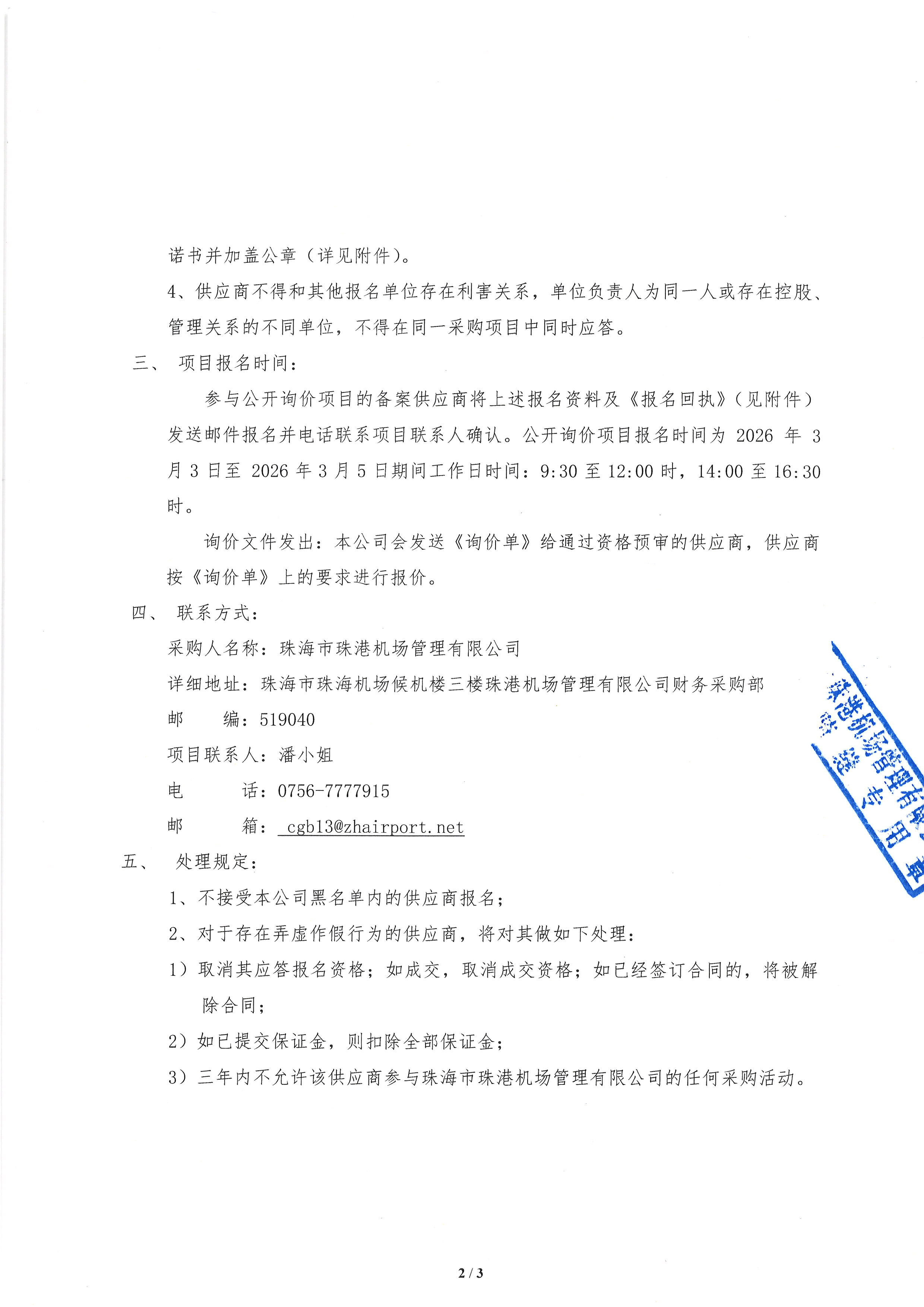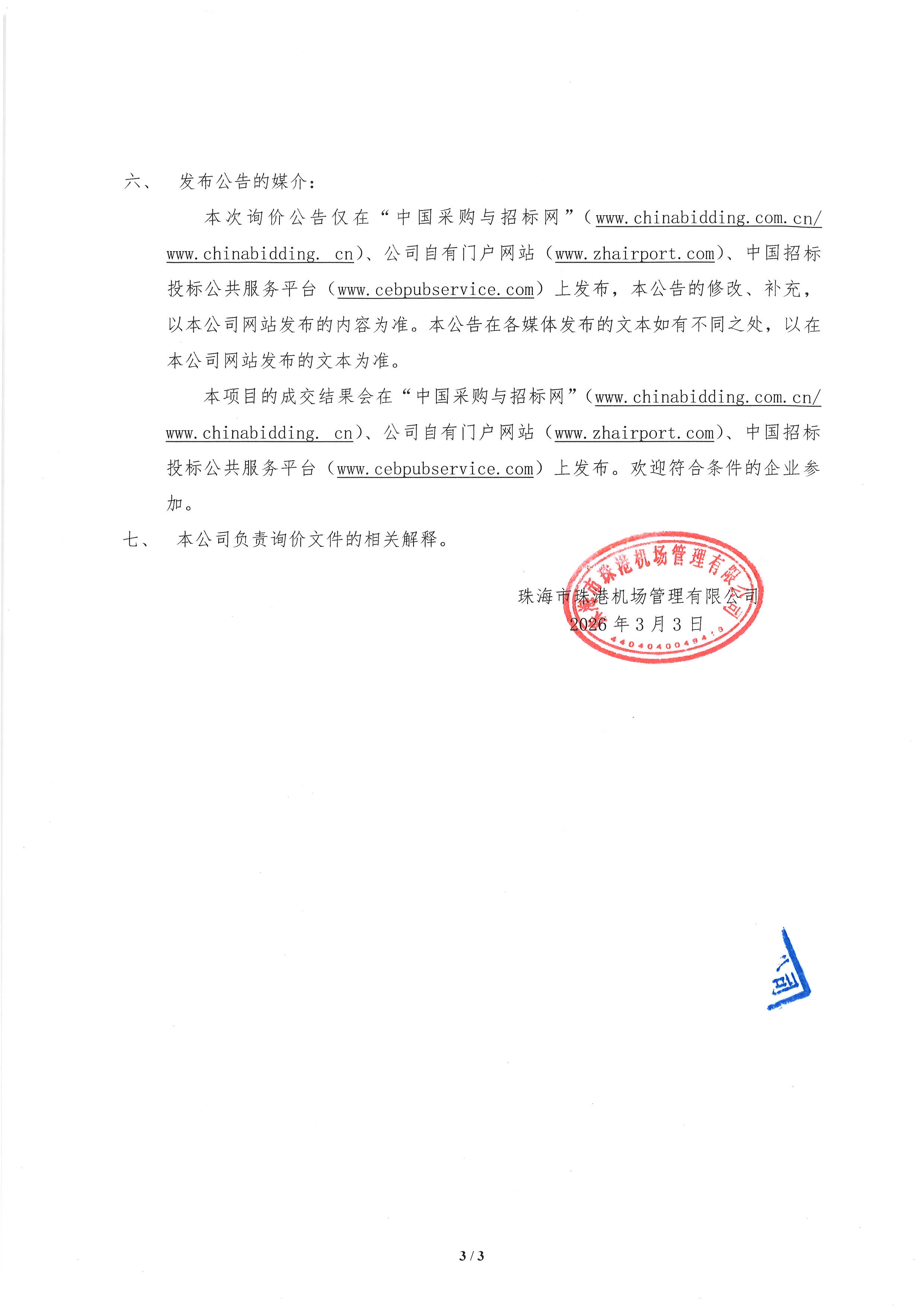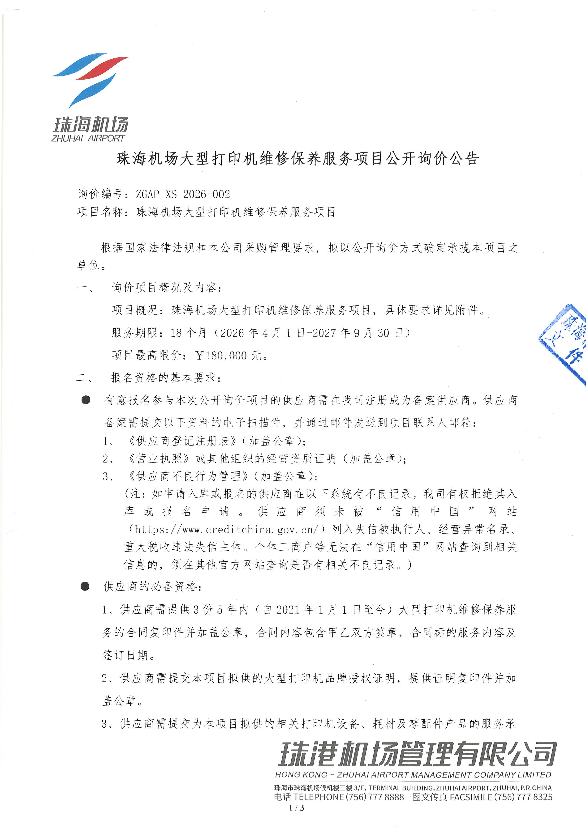 珠海机场大型打印机维修保养服务项目公开询价公告