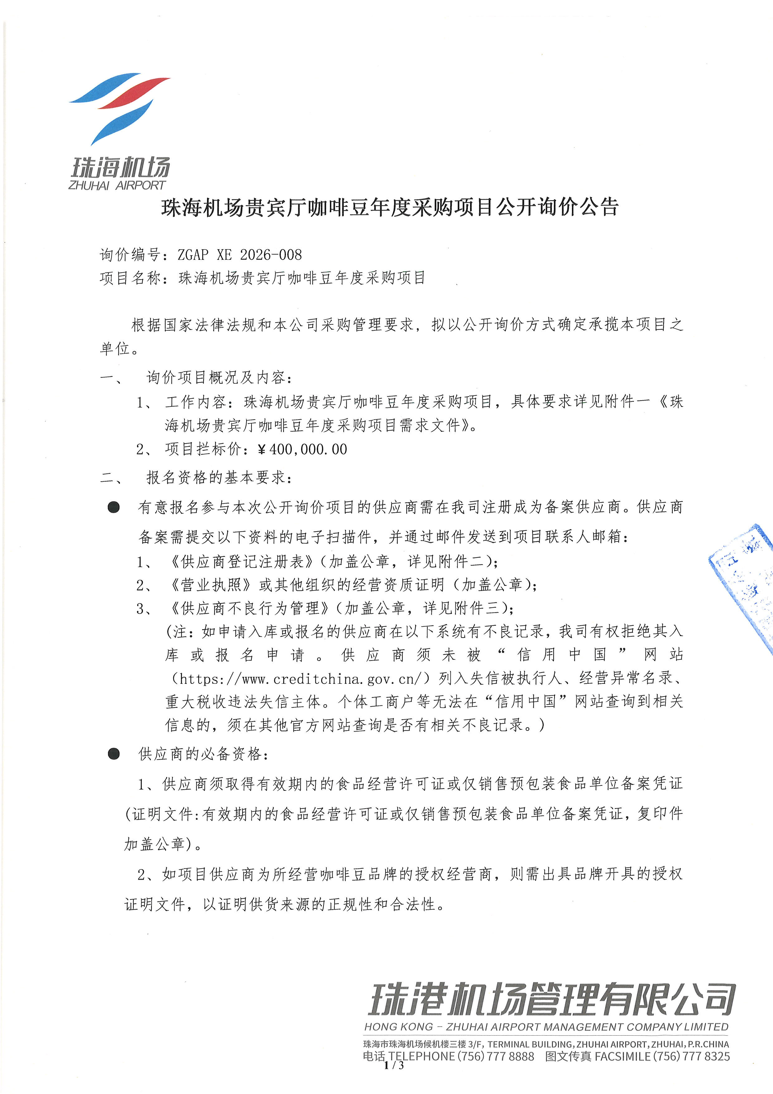 附件一:珠海机场贵宾厅咖啡豆年度采购项目需求文件