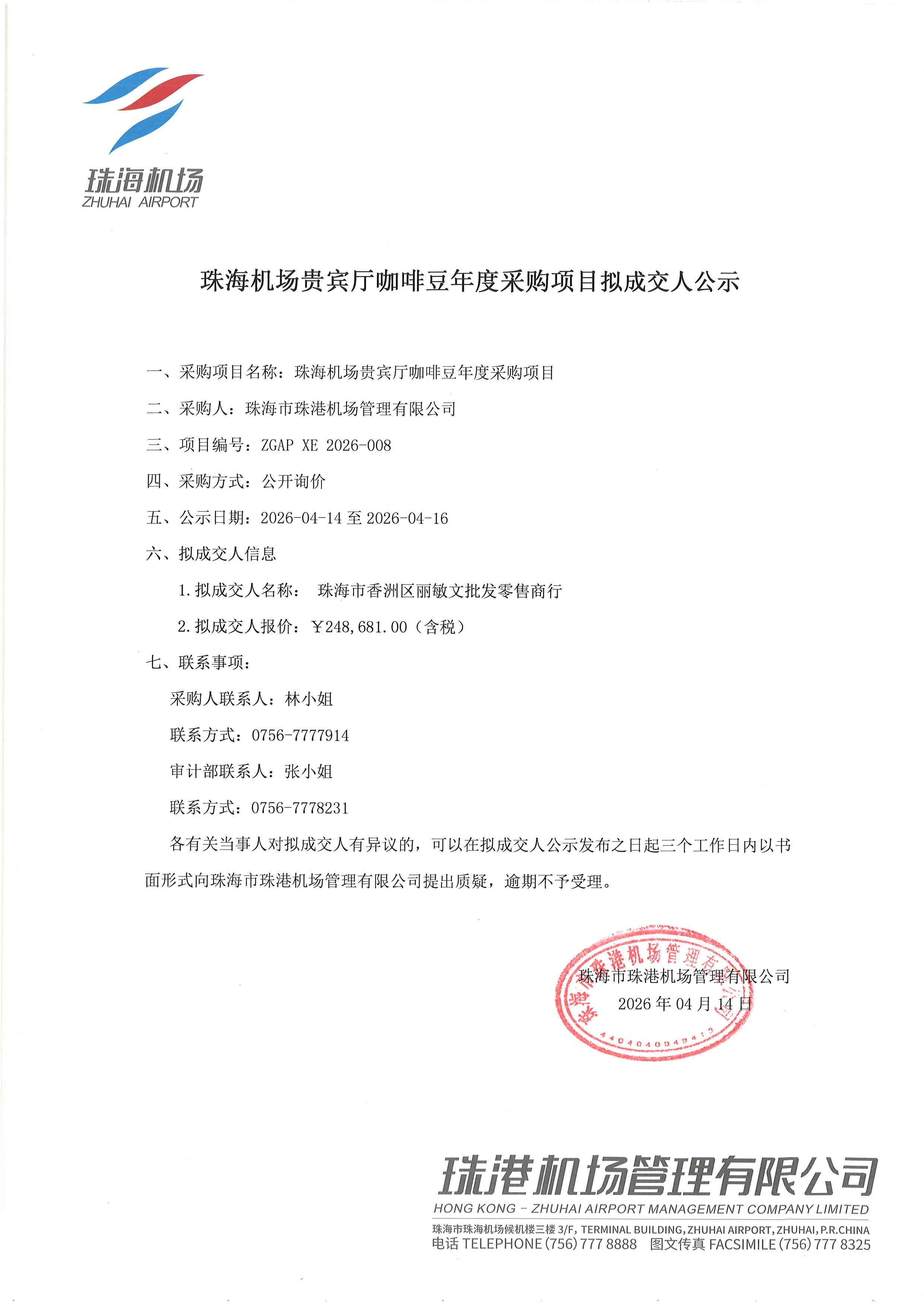 珠海机场贵宾厅咖啡豆年度采购项目拟成交人公示