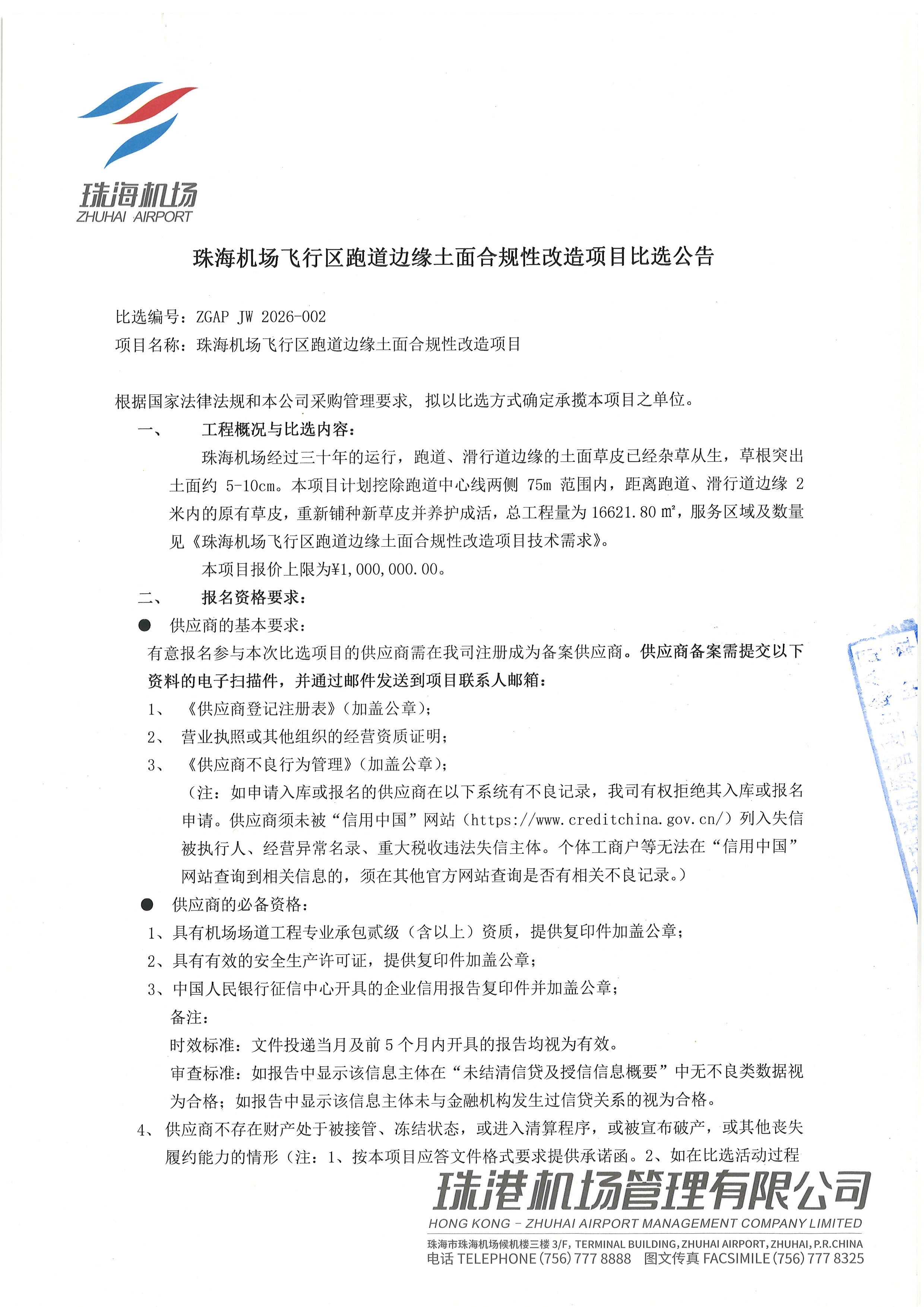 珠海机场飞行区跑道边缘土面合规性改造项目比选公告