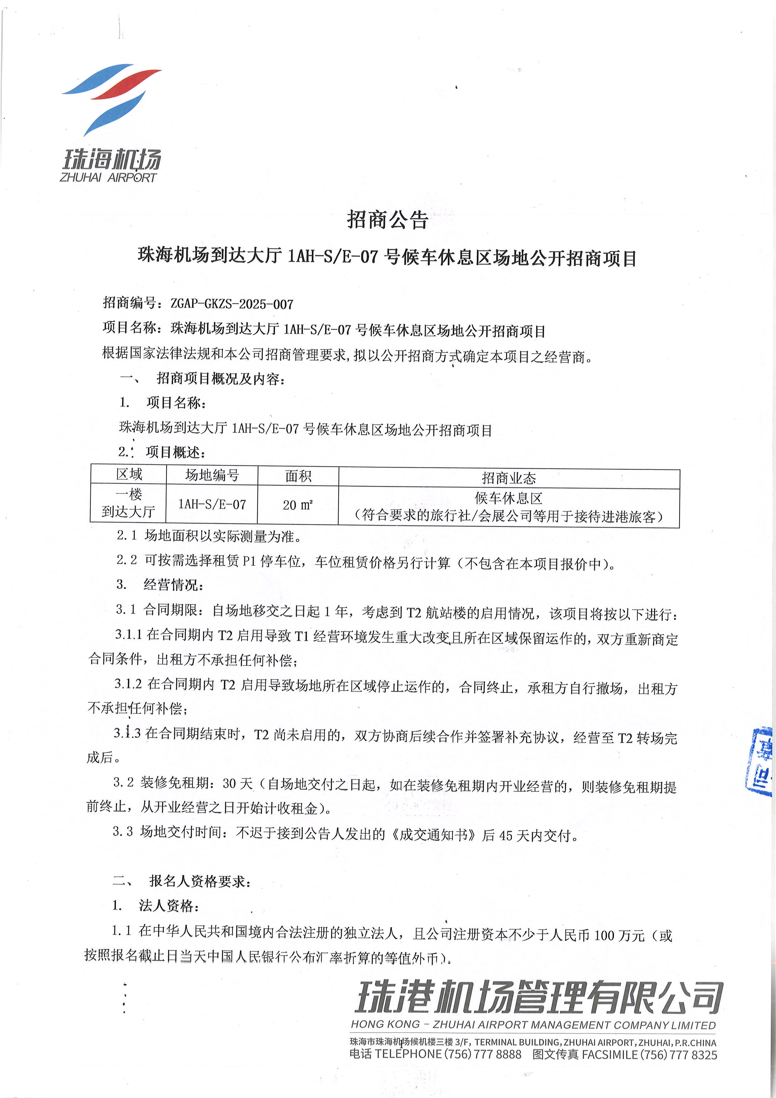 珠海机场到达大厅1AH-S/E-07号候车休息区场地公开招商项目
