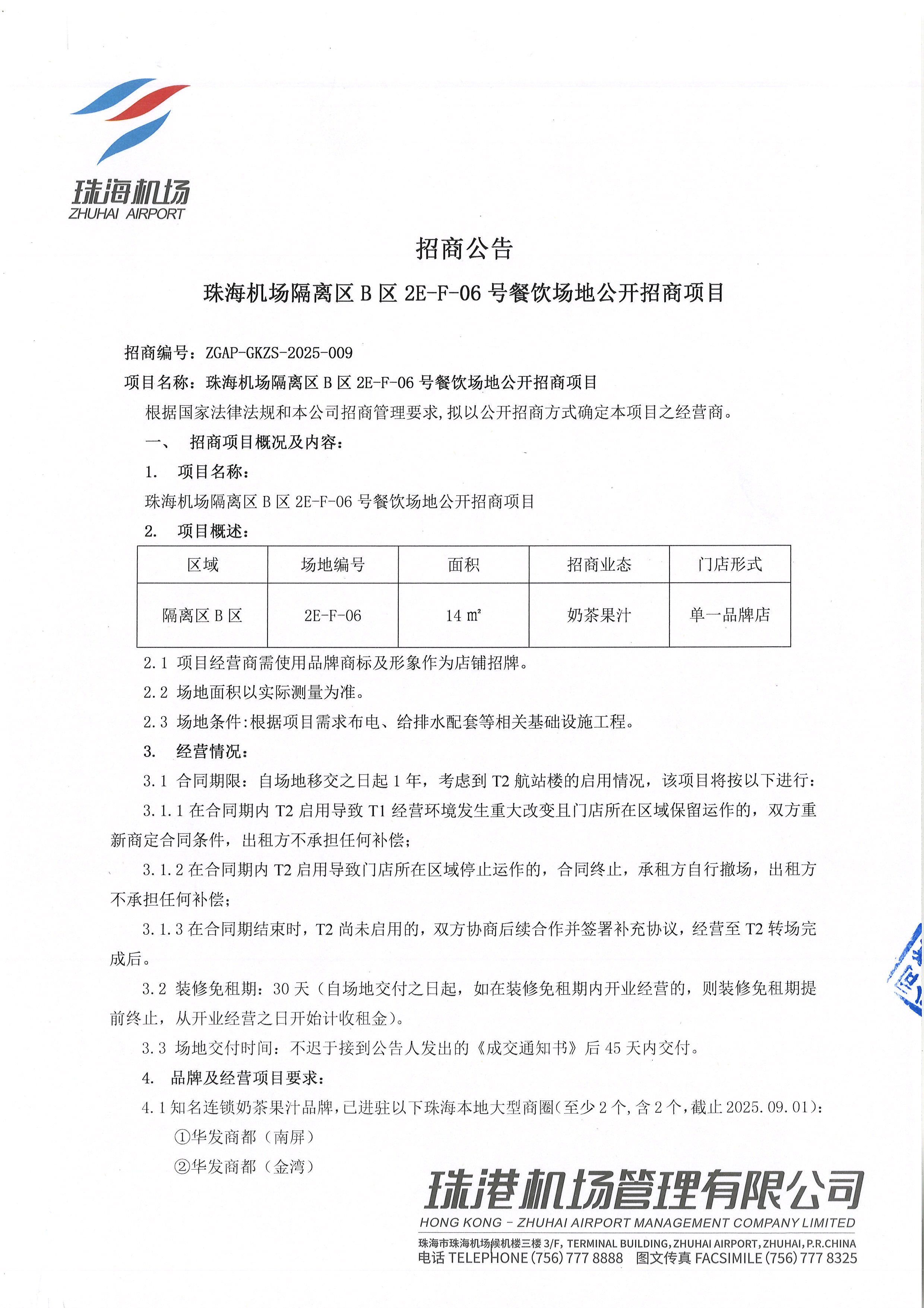 珠海机场隔离区B区2E-F-06号餐饮场地公开招商项目