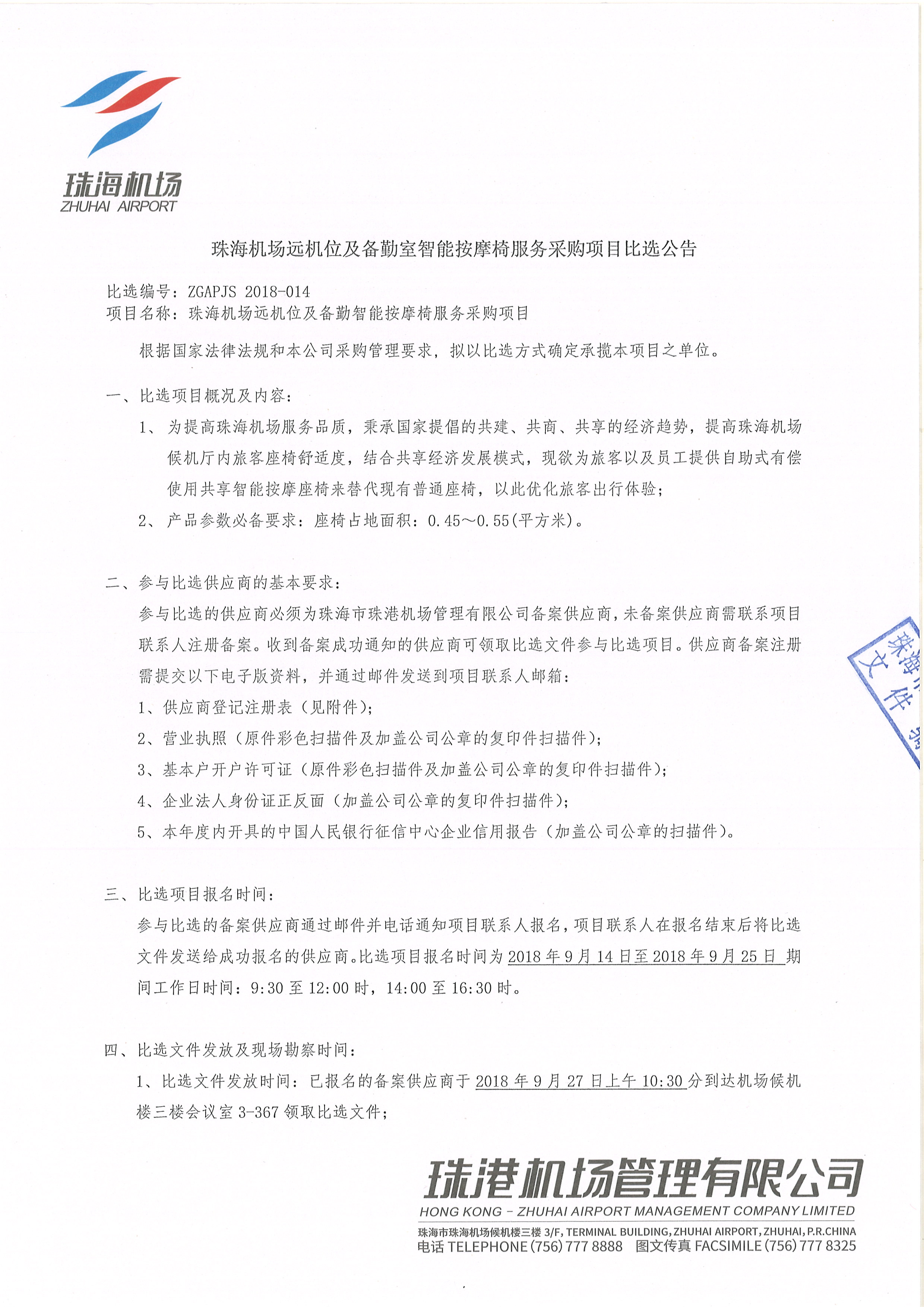 珠海机场远机位及备勤室智能按摩椅服务采购项目比选公告