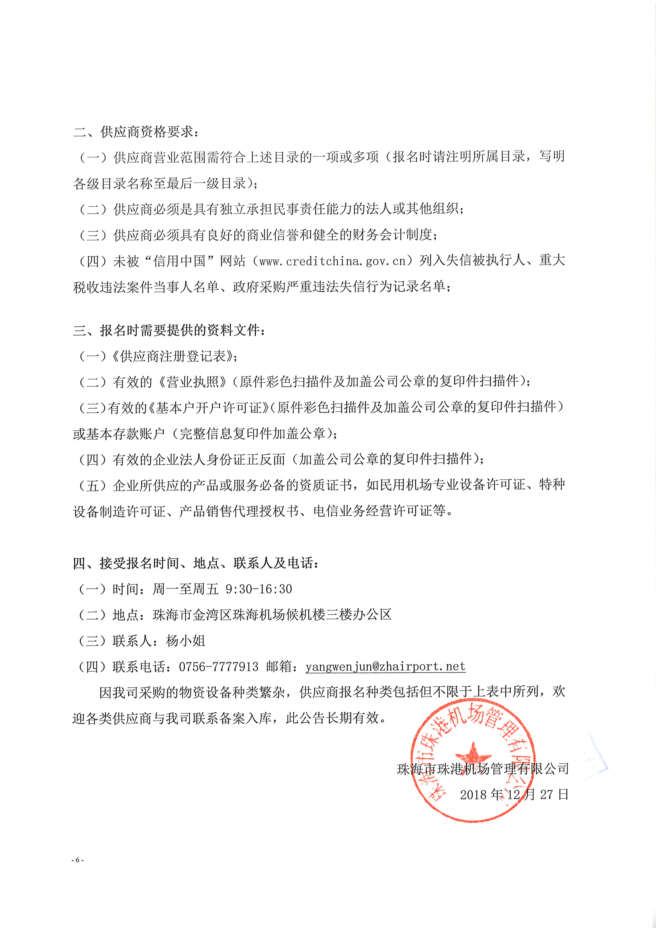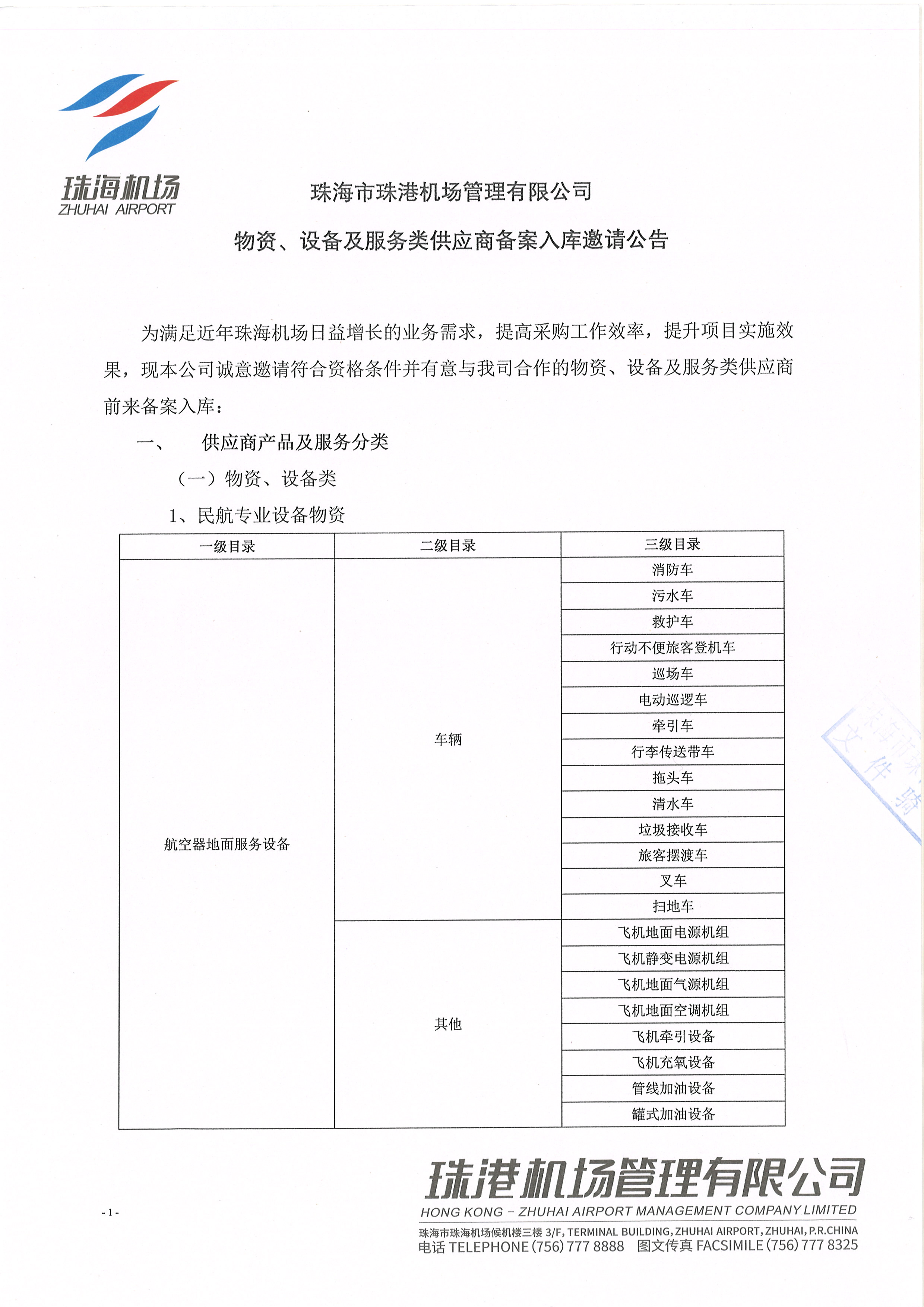珠海市珠港机场管理有限公司物资、设备及服务类供应商备案入库邀请公告