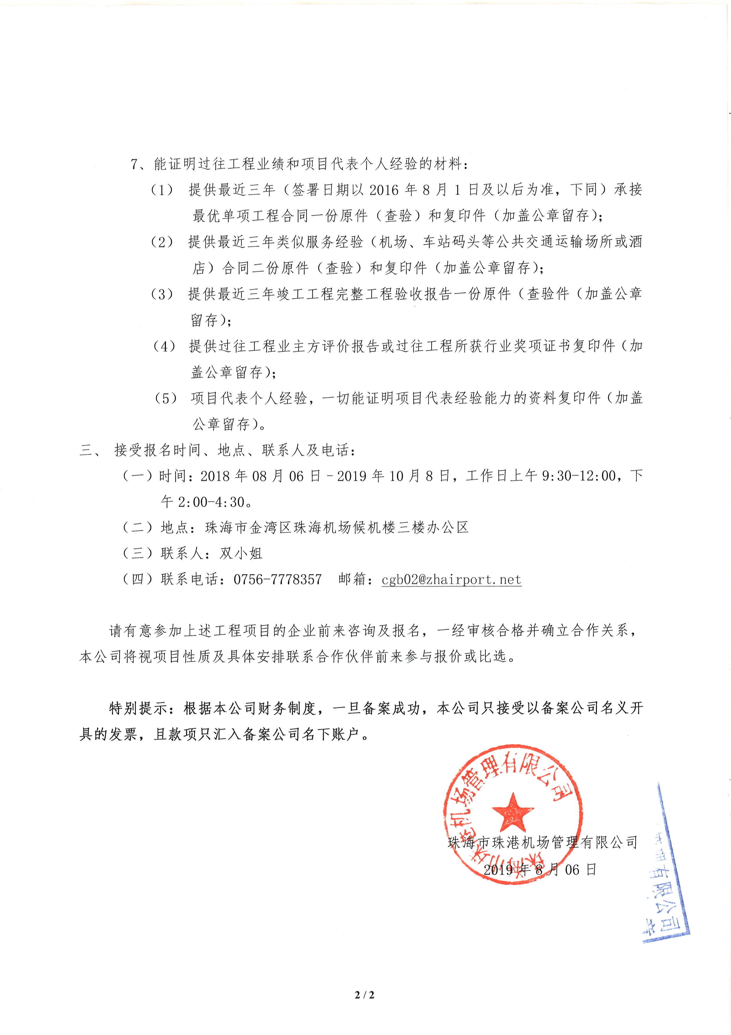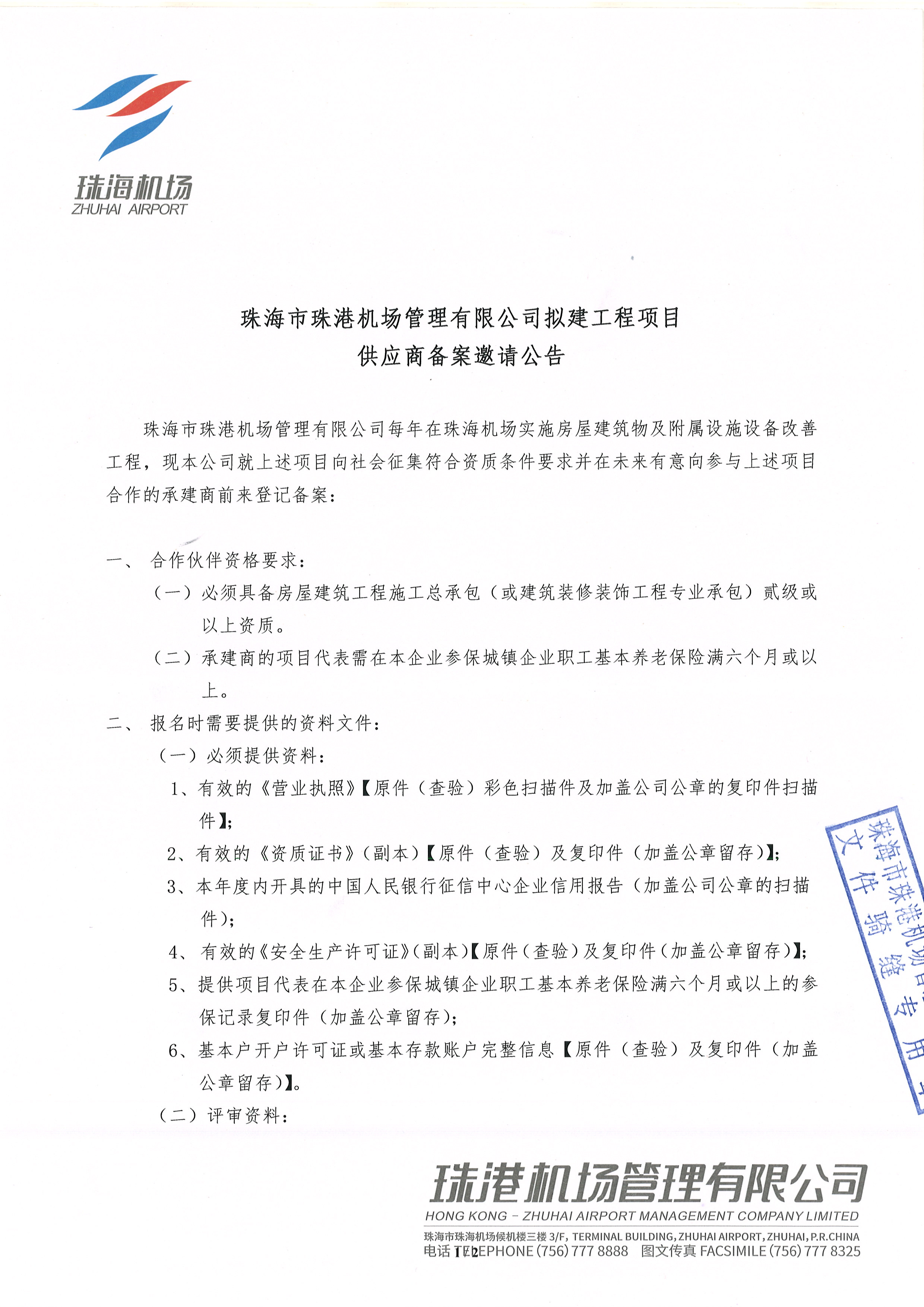 珠海市珠港机场管理有限公司拟建工程项目供应商备案公告
