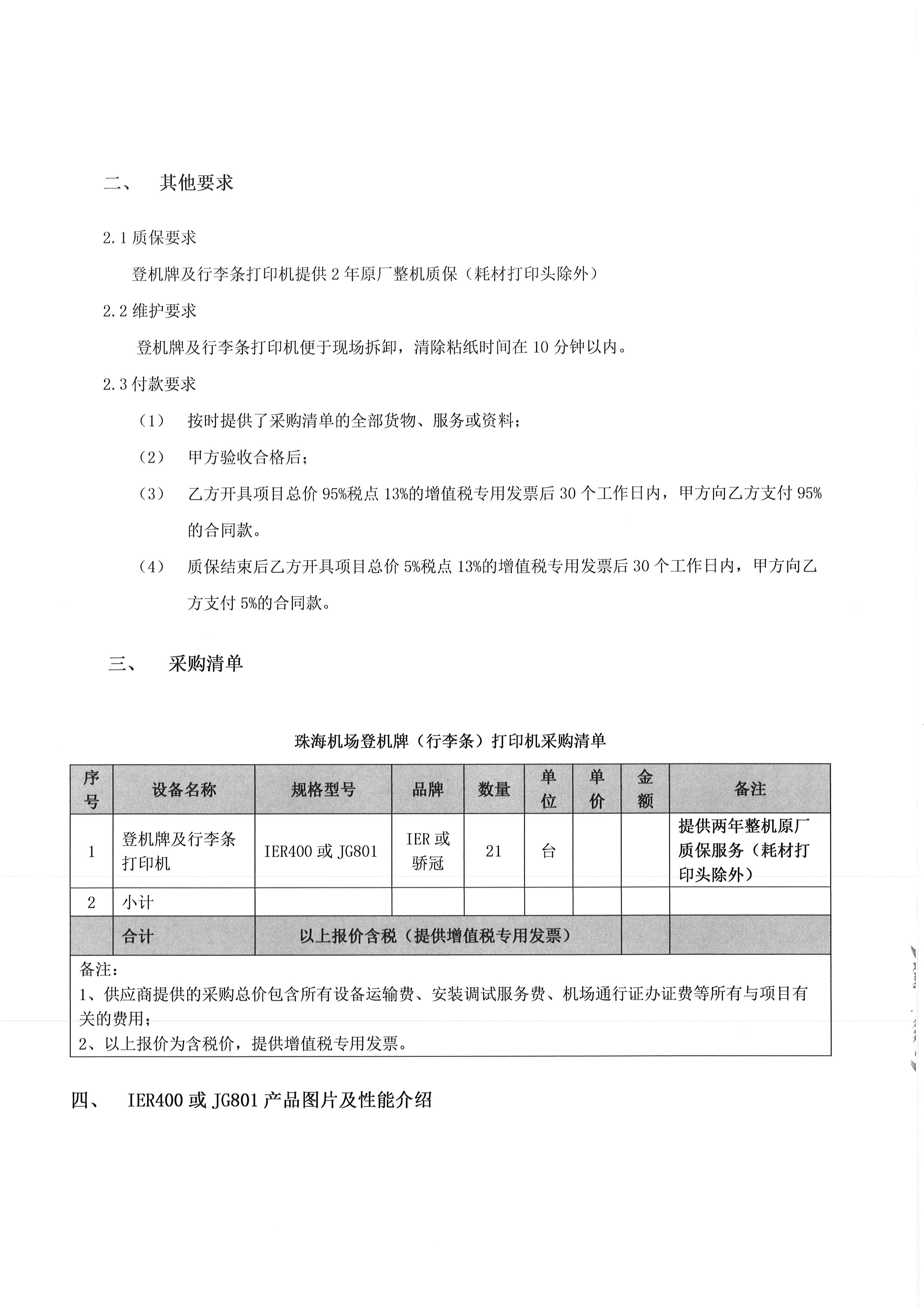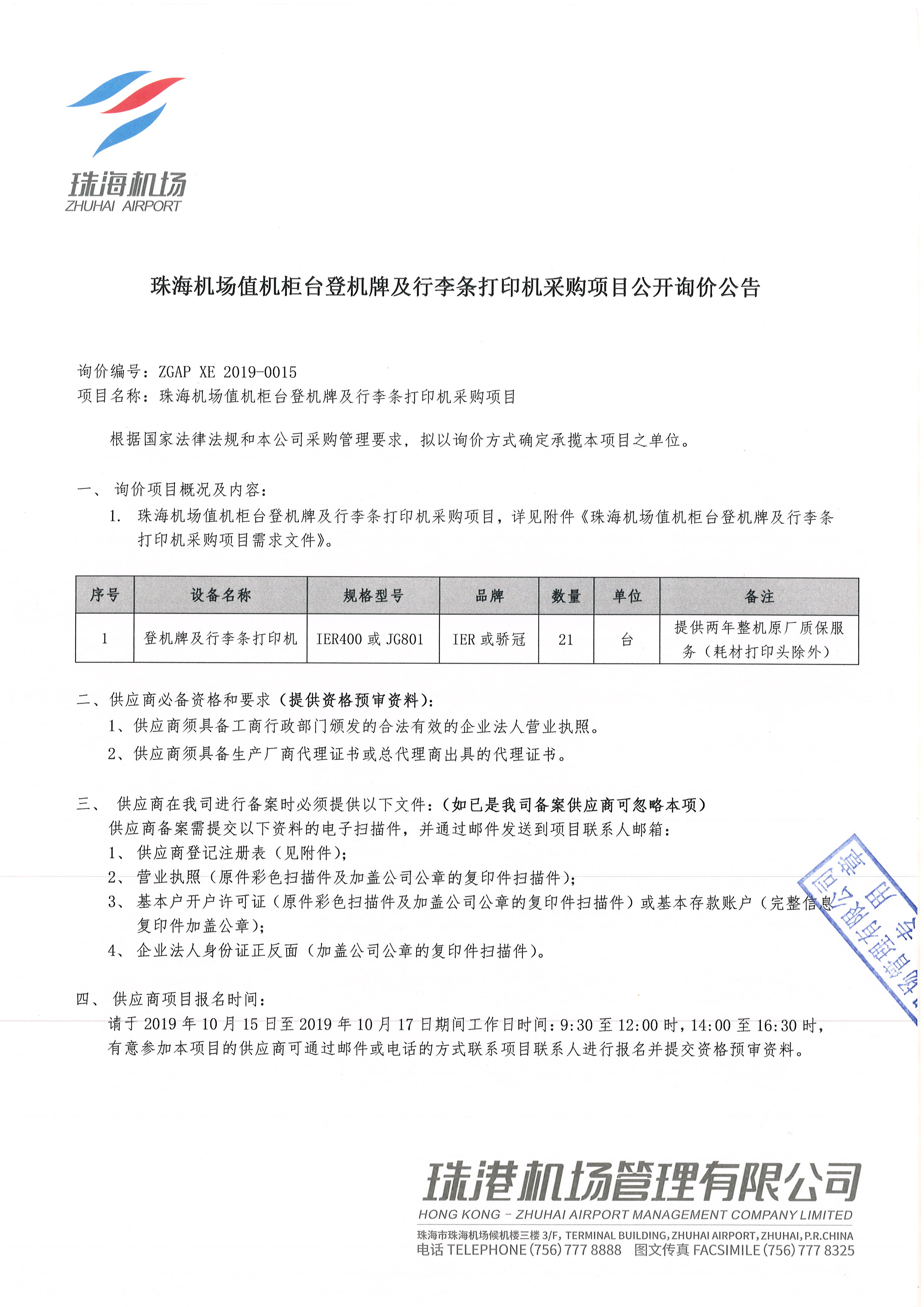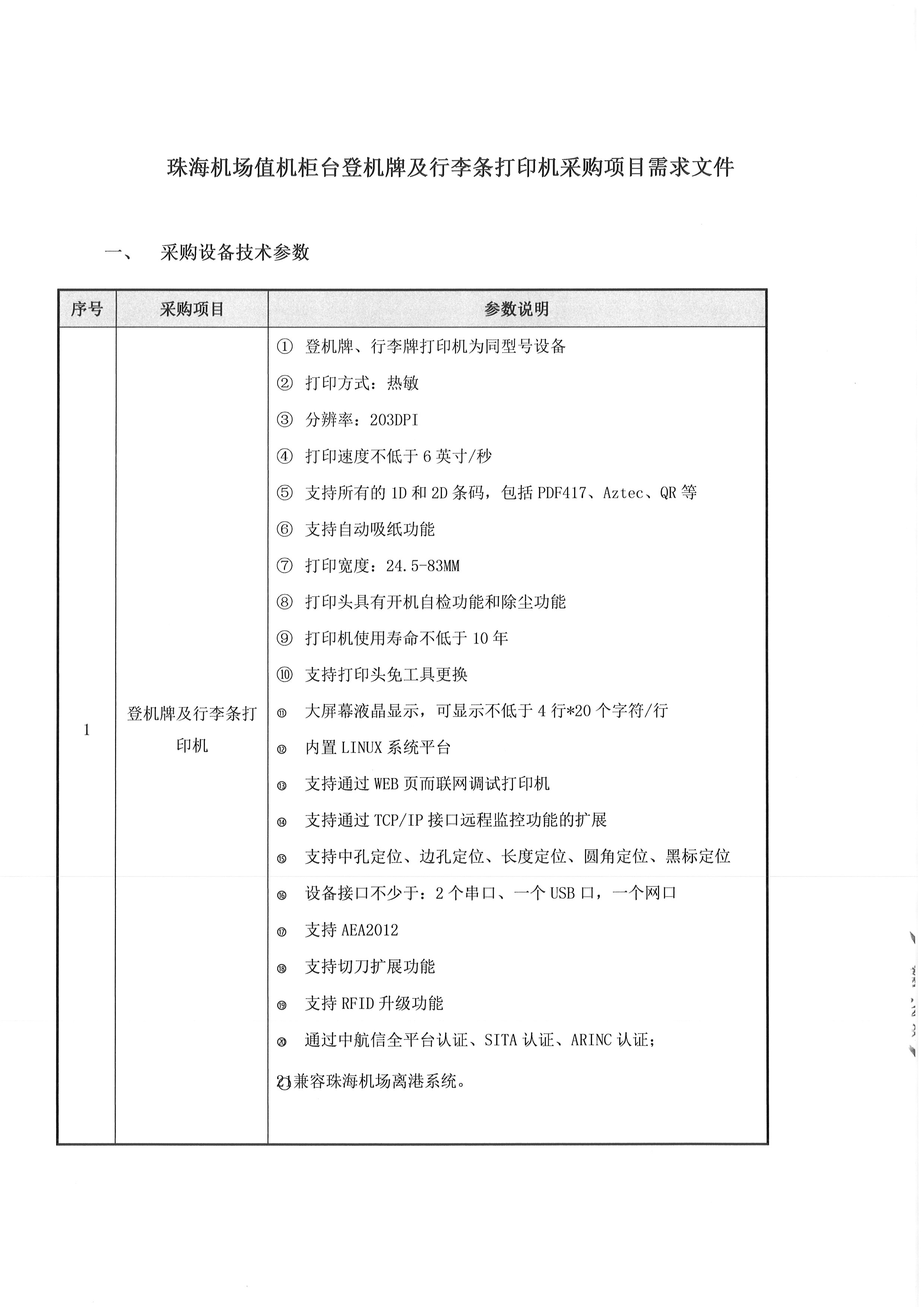 珠海机场值机柜台登机牌及行李条打印机采购项目公开询价公告