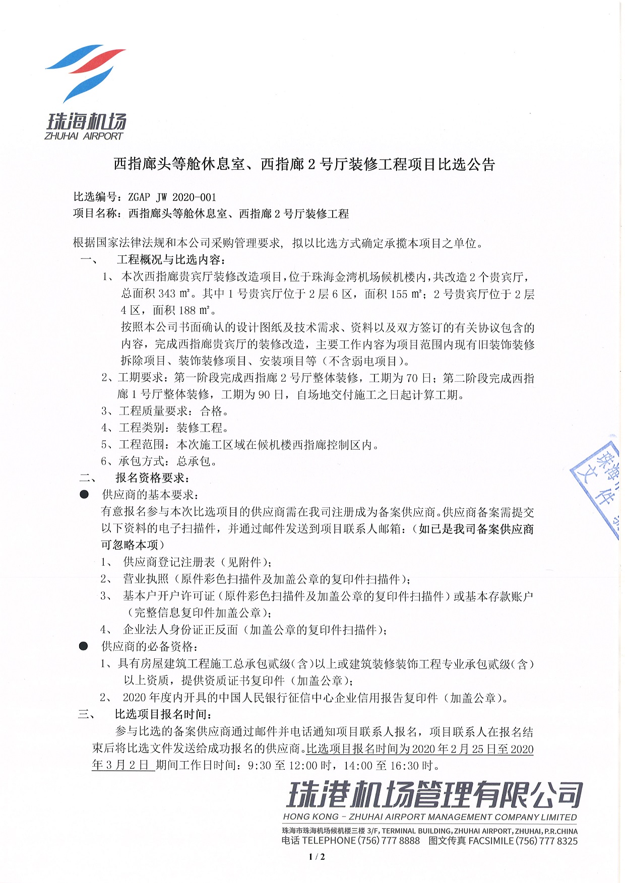 西指廊头等舱休息室、西指廊2号厅装修工程项目比选公告