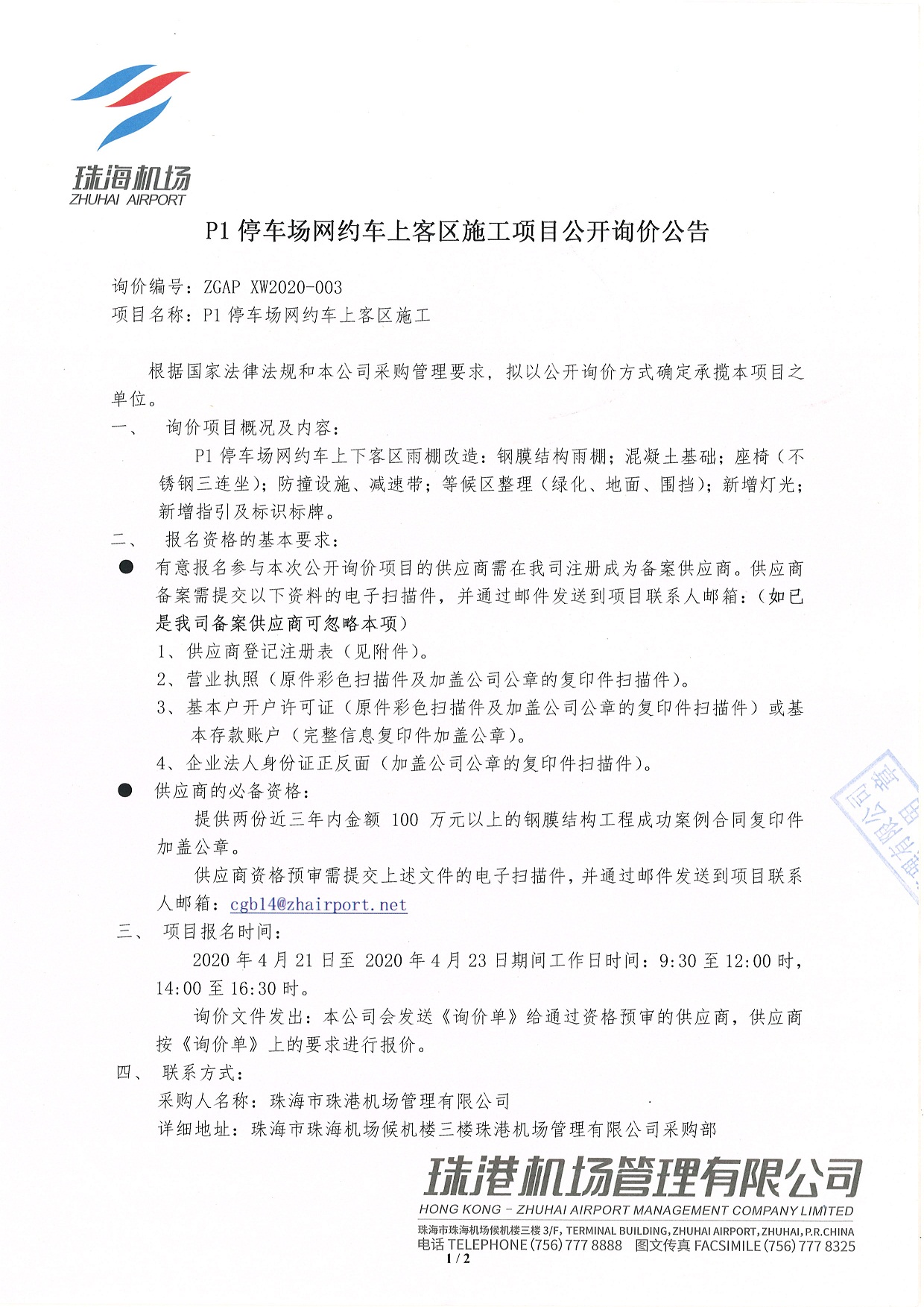 P1停车场网约车上客区施工项目公开询价公告