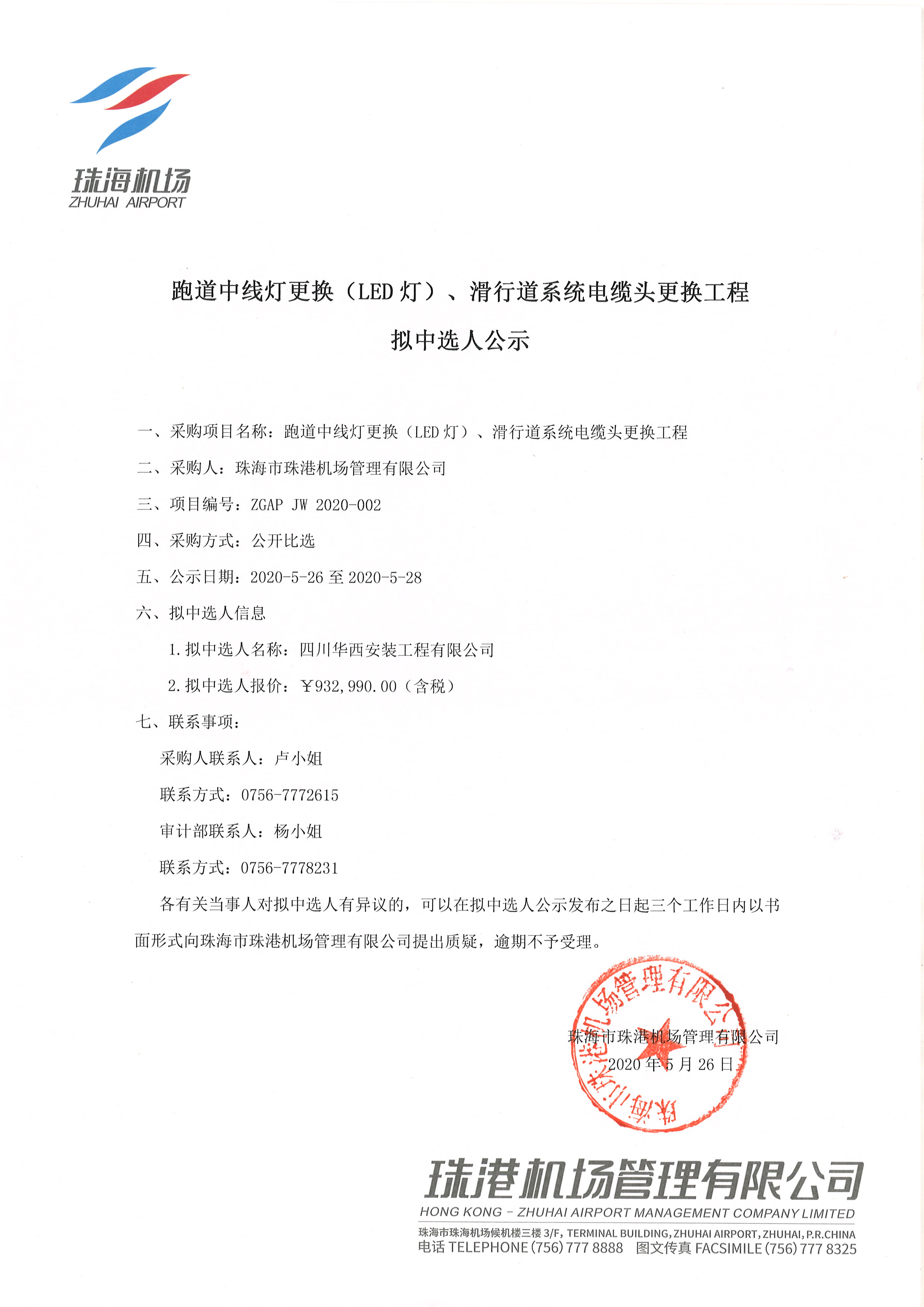 跑道中线灯更换(LED灯)、滑行道系统电缆头更换工程拟中选人公示