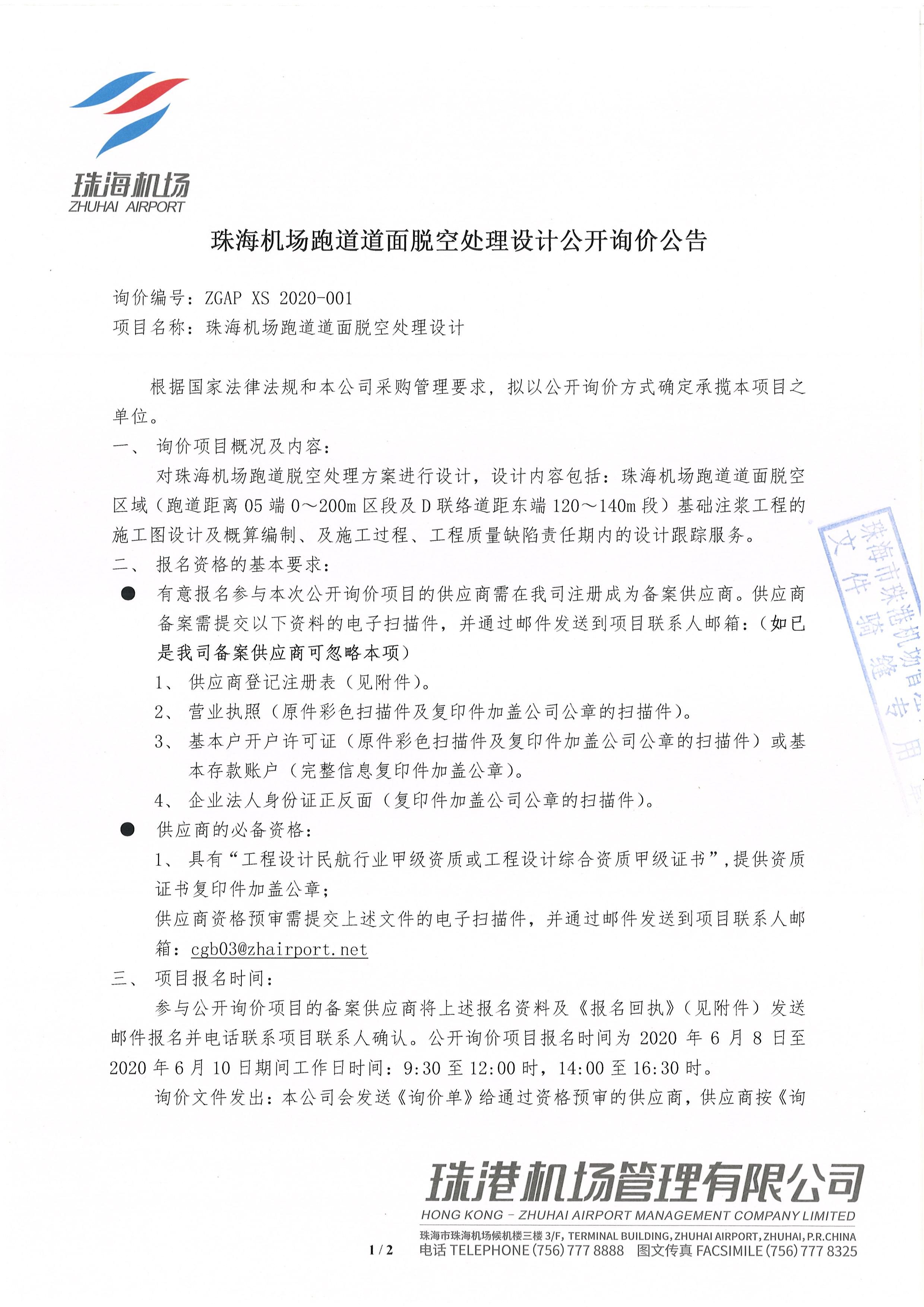 珠海机场跑道道面脱空处理设计公开询价公告