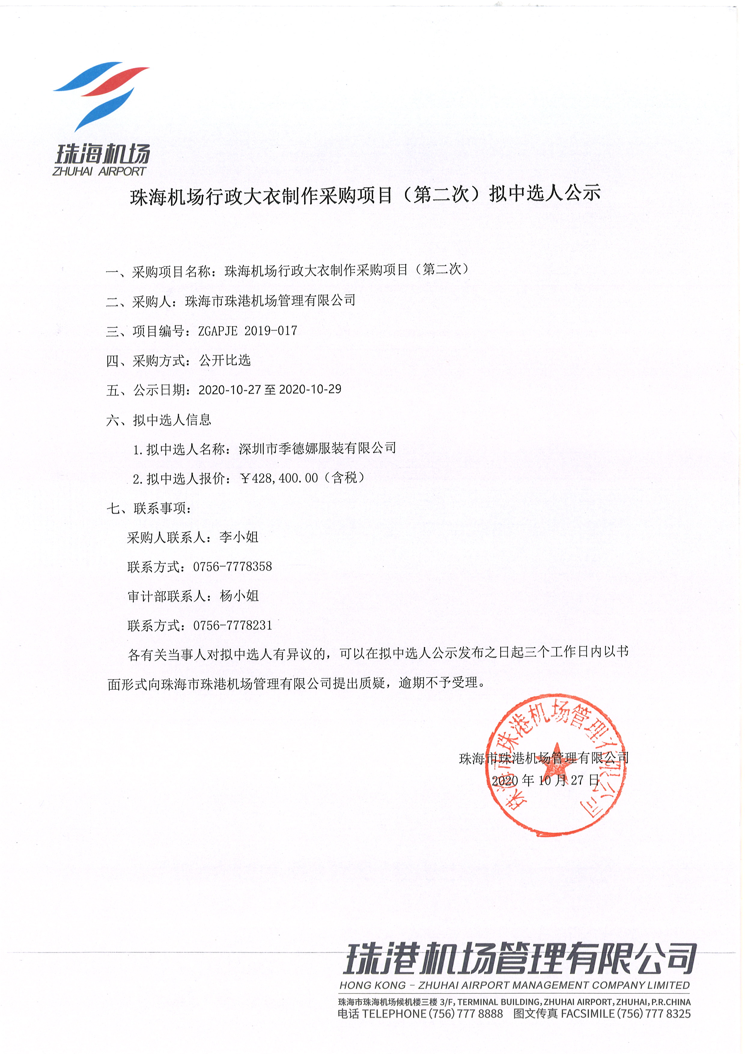珠海机场行政大衣制作采购项目(第二次)拟中选人公示