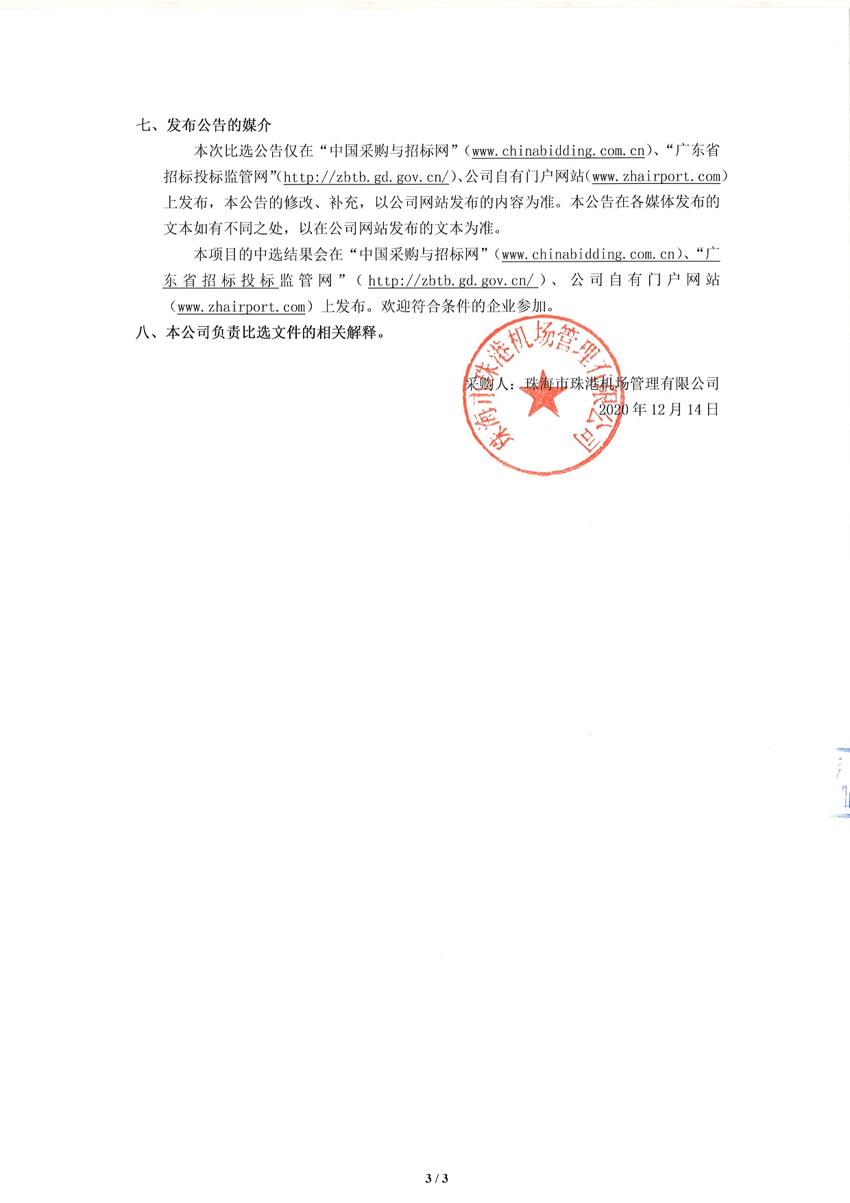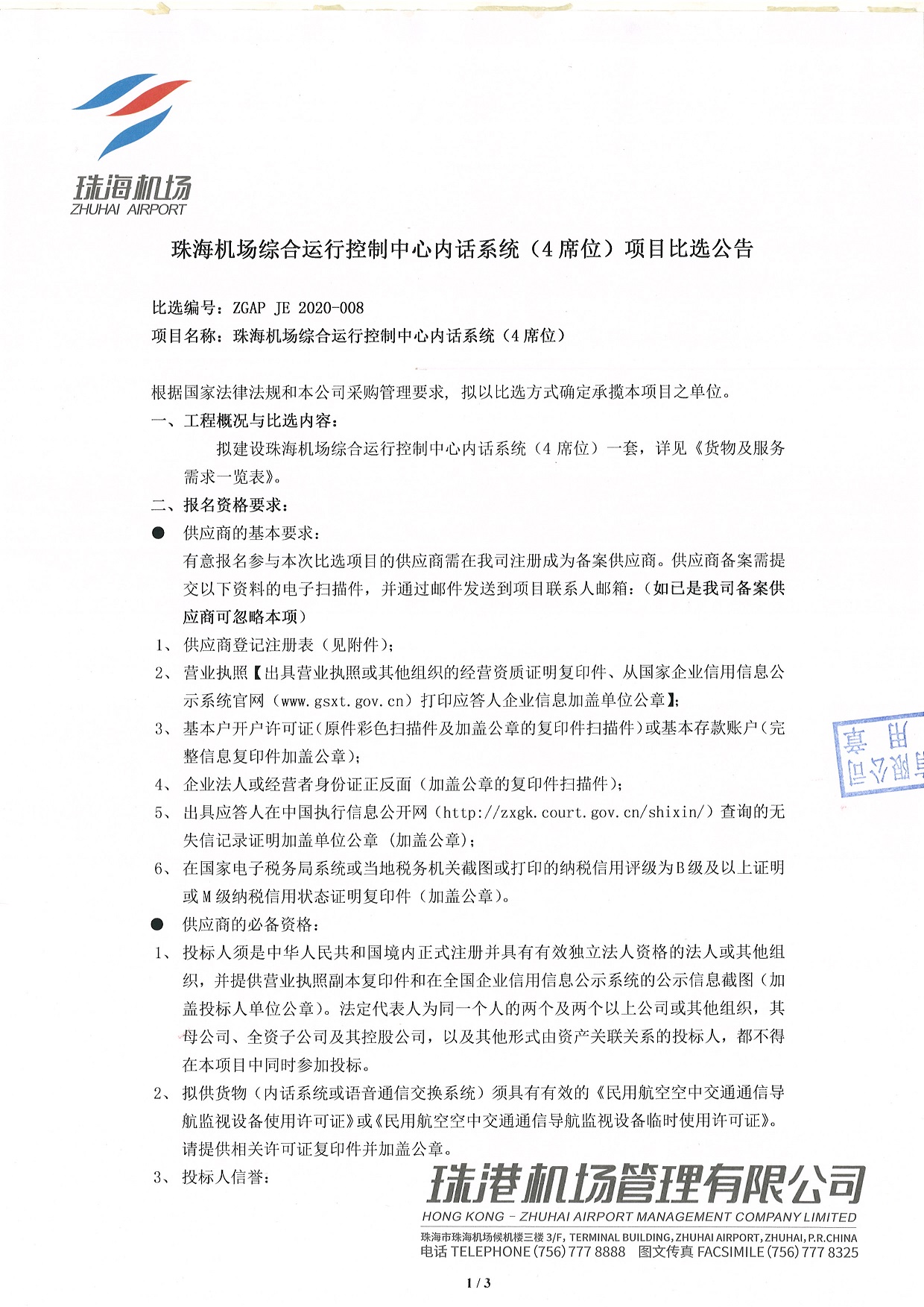 珠海机场综合运行控制中心内话系统(4席位)项目比选公告