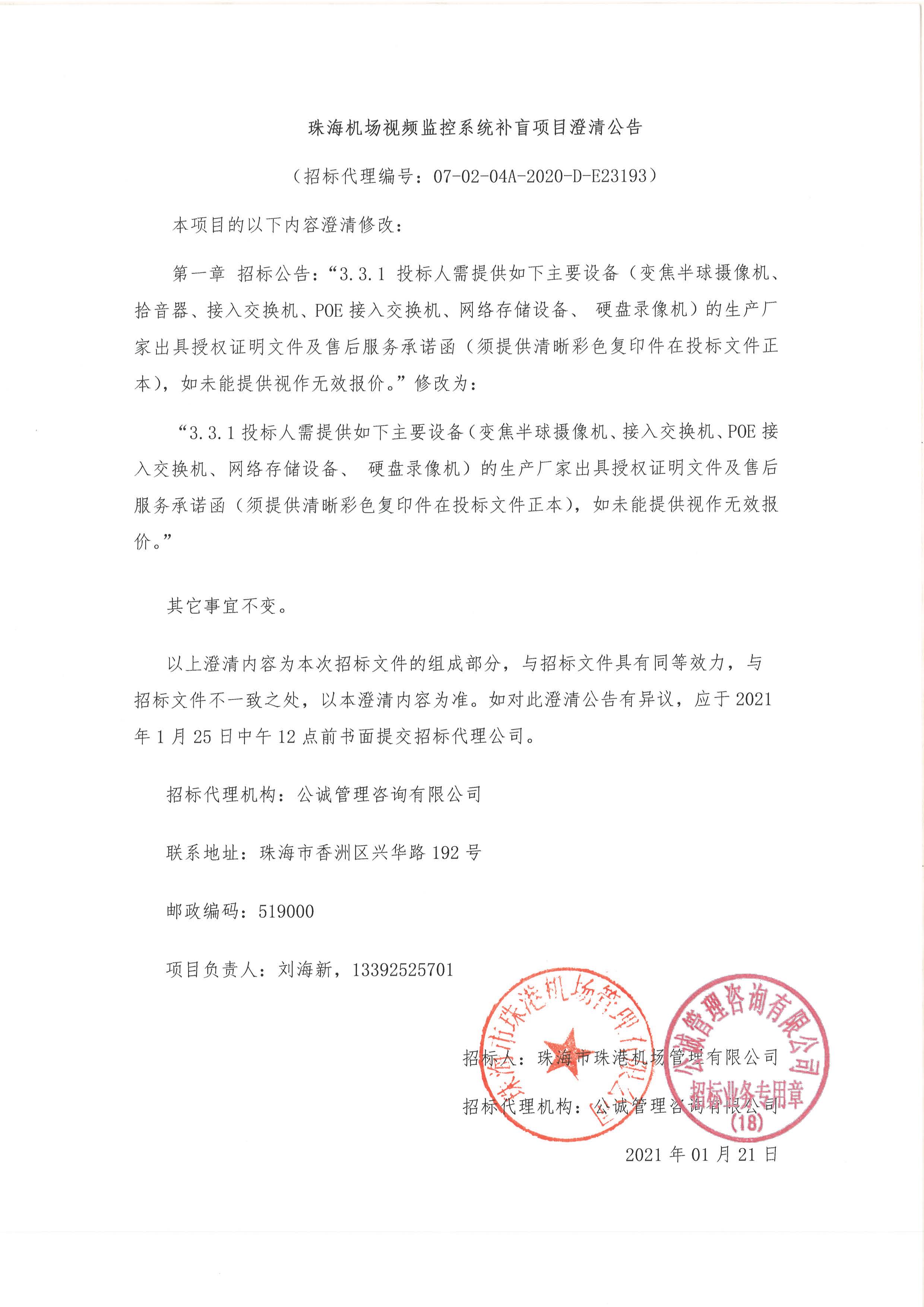 珠海机场视频监控系统补盲项目澄清公告