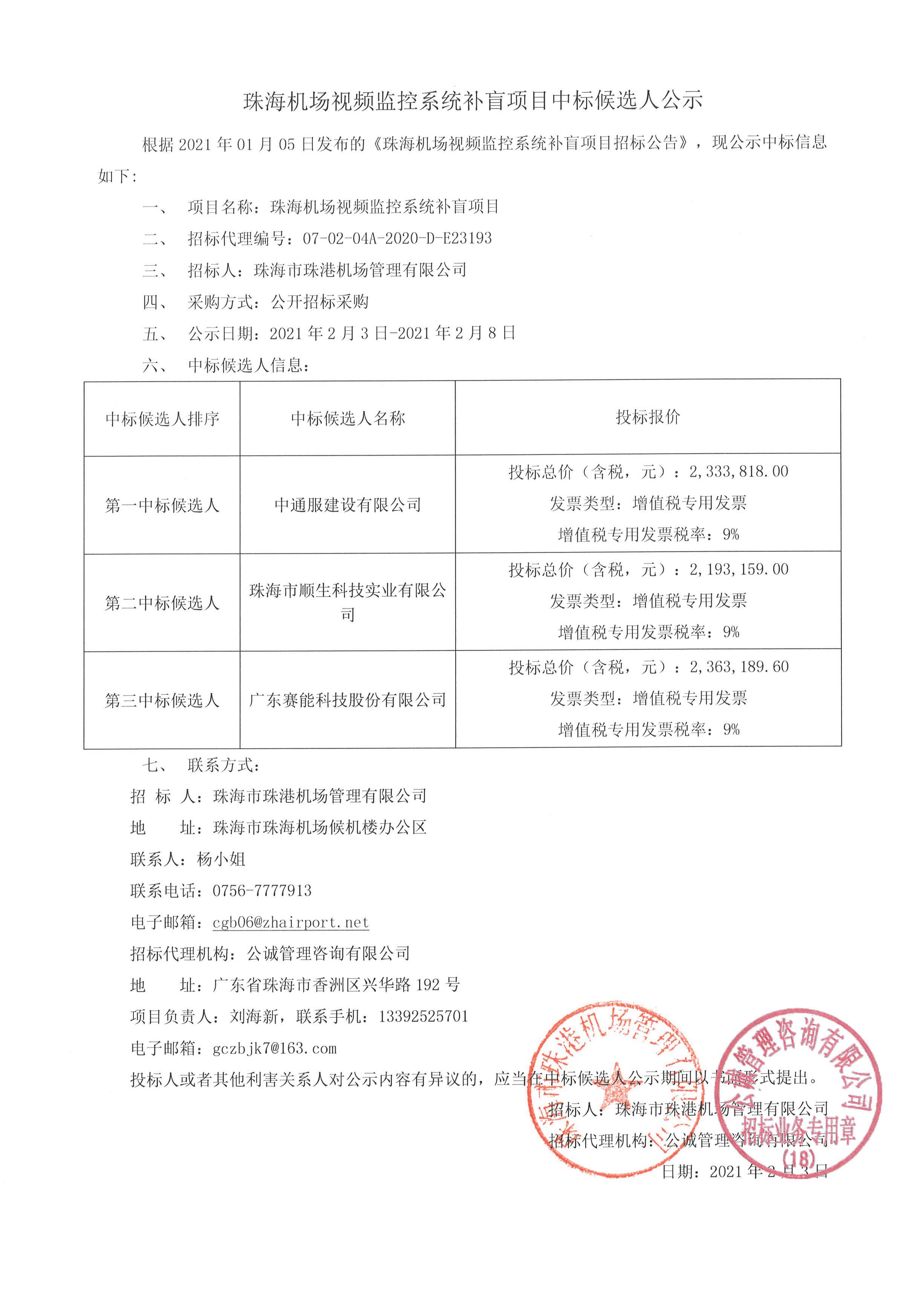 珠海机场视频监控系统补盲项目中标候选人公示