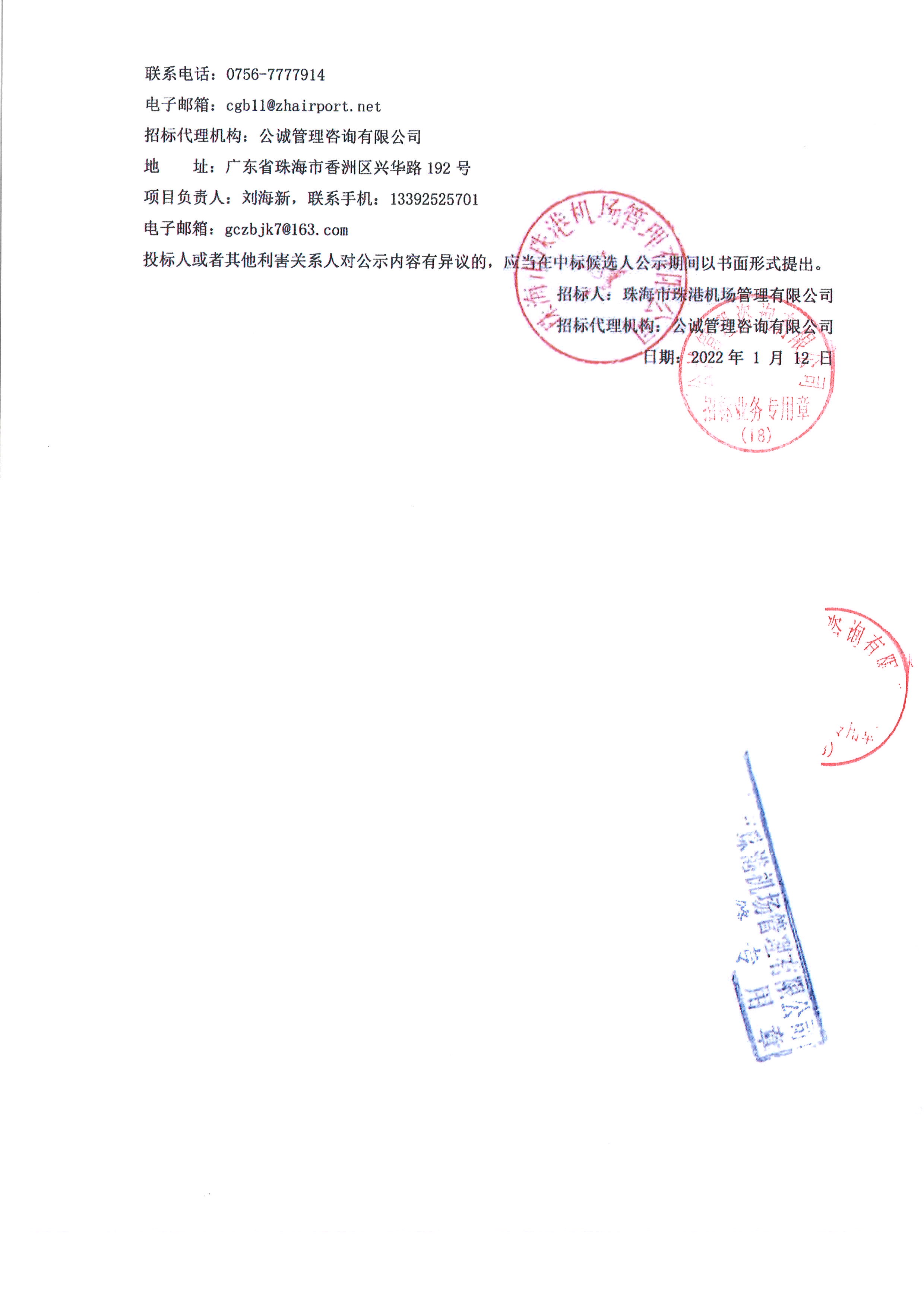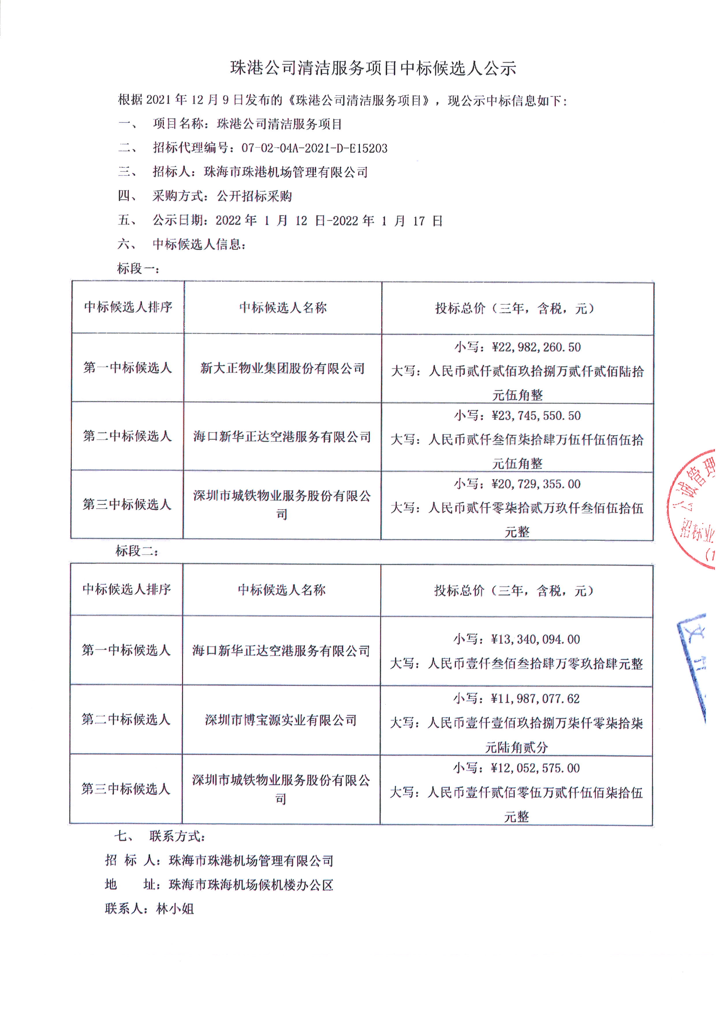 珠港公司清洁服务项目中标候选人公示