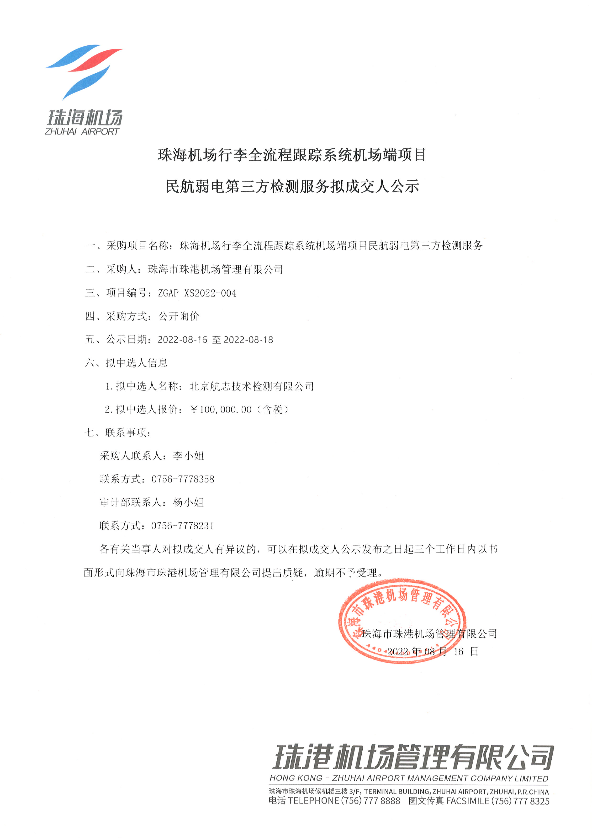 珠海机场行李全流程跟踪系统机场端项目民航弱电第三方检测服务拟成交人公示