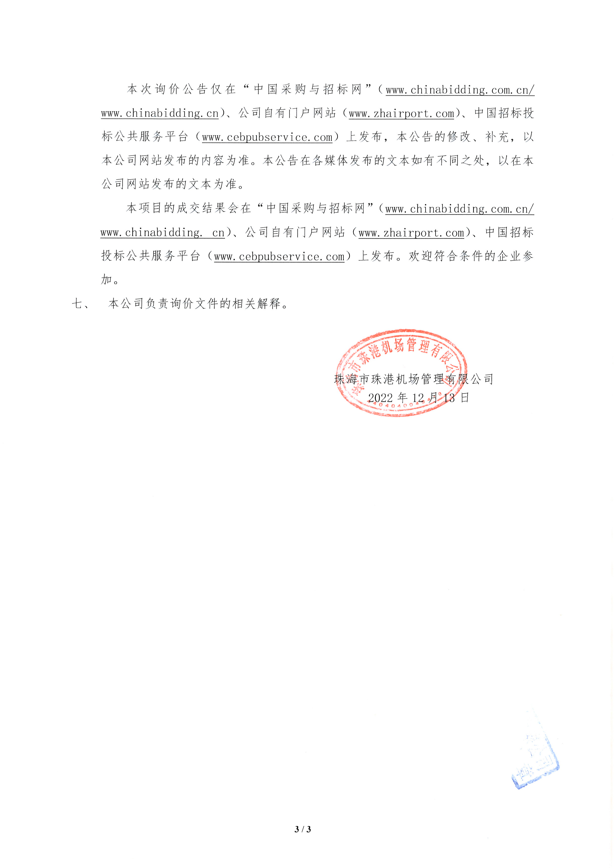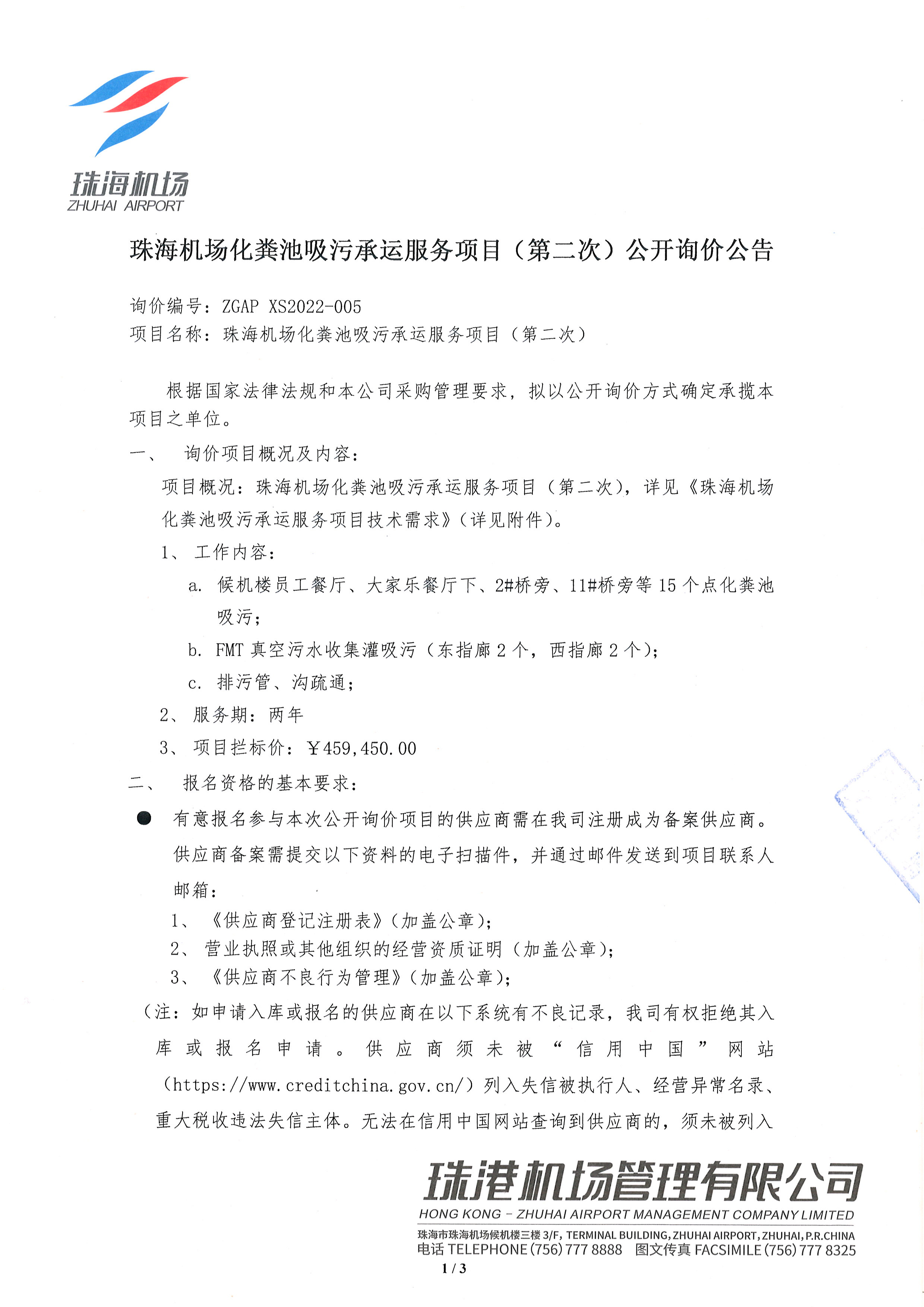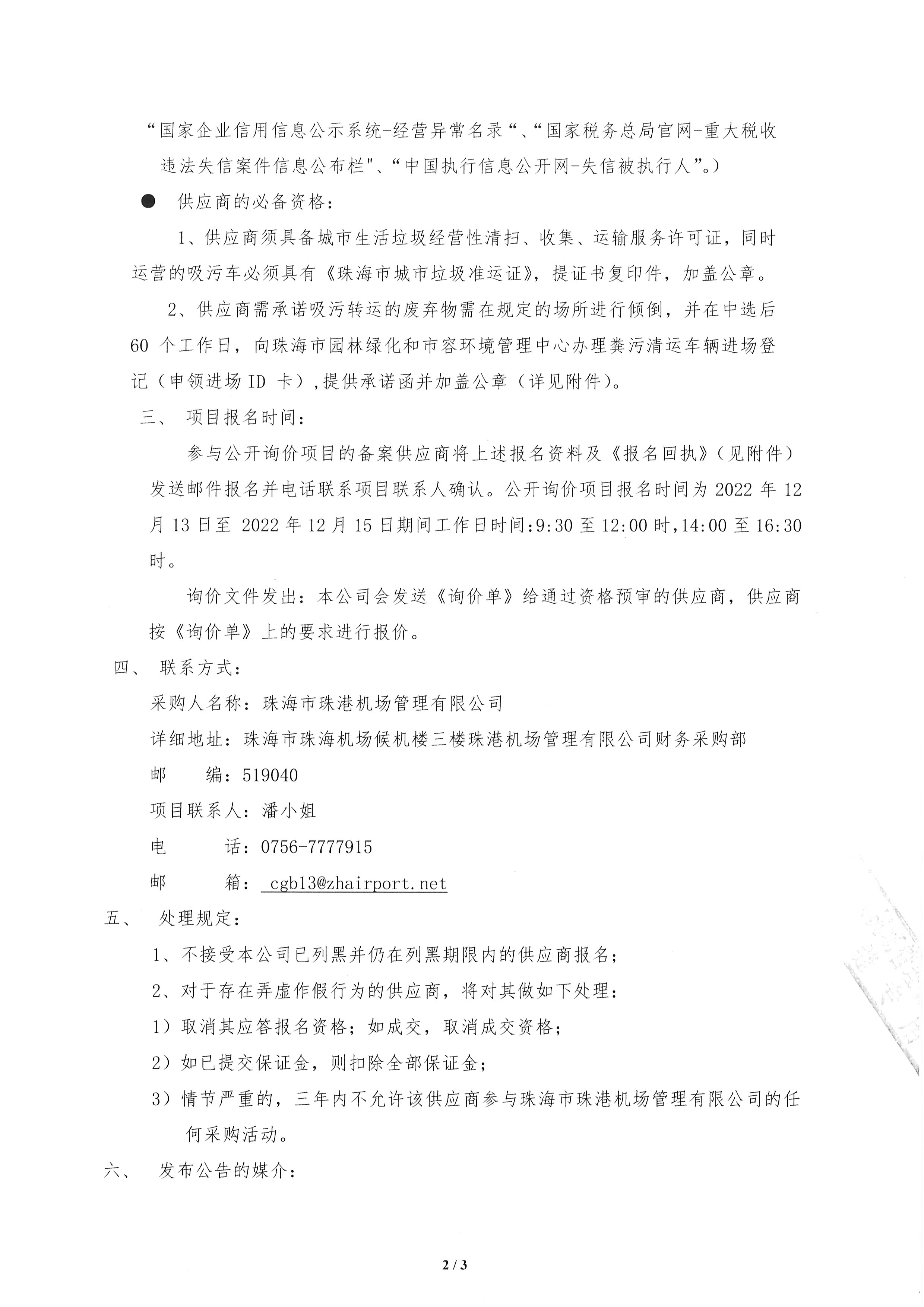 珠海机场化粪池吸污承运服务项目(第二次)公开询价公告