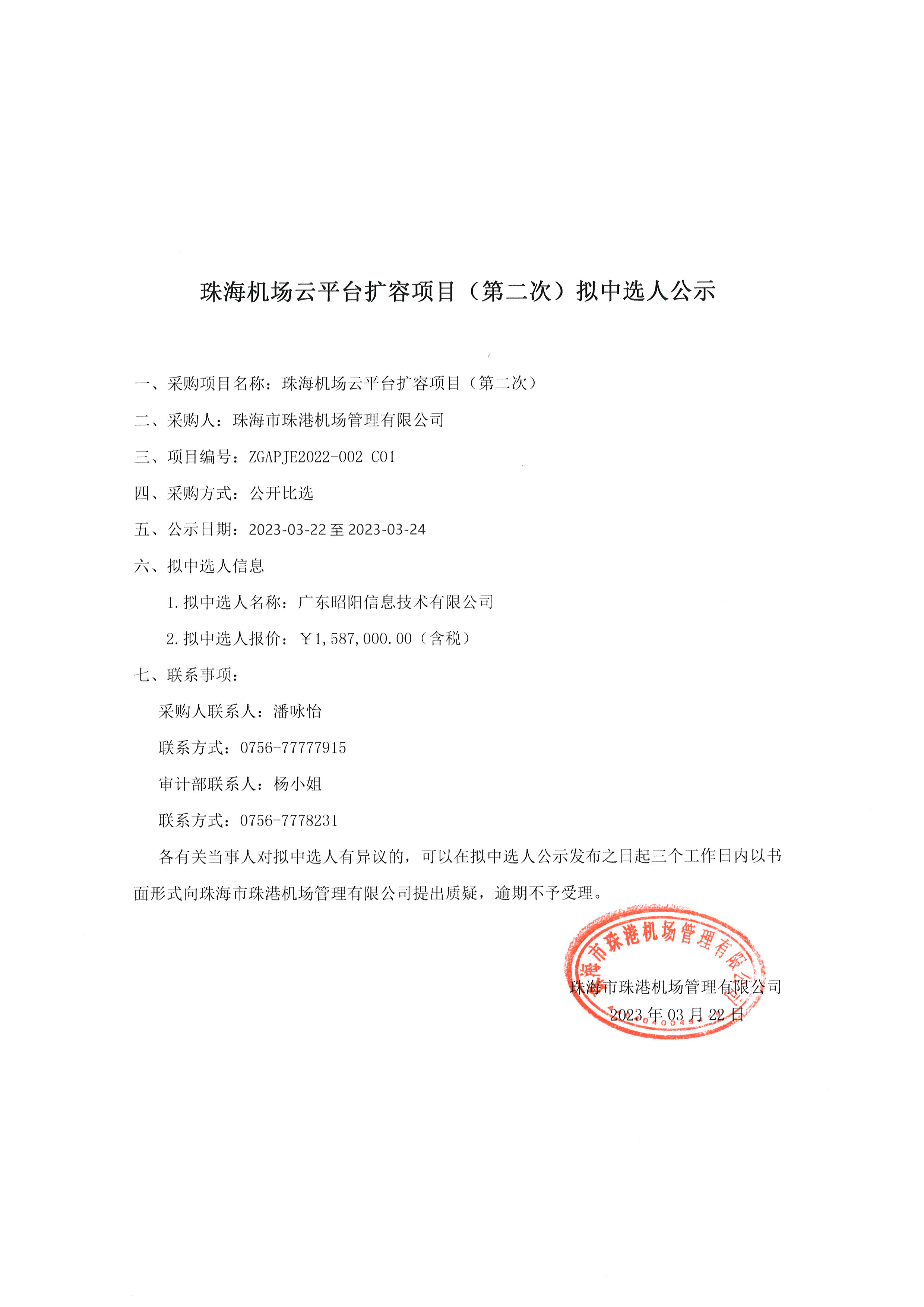 珠海机场云平台扩容项目(第二次)拟中选人公示