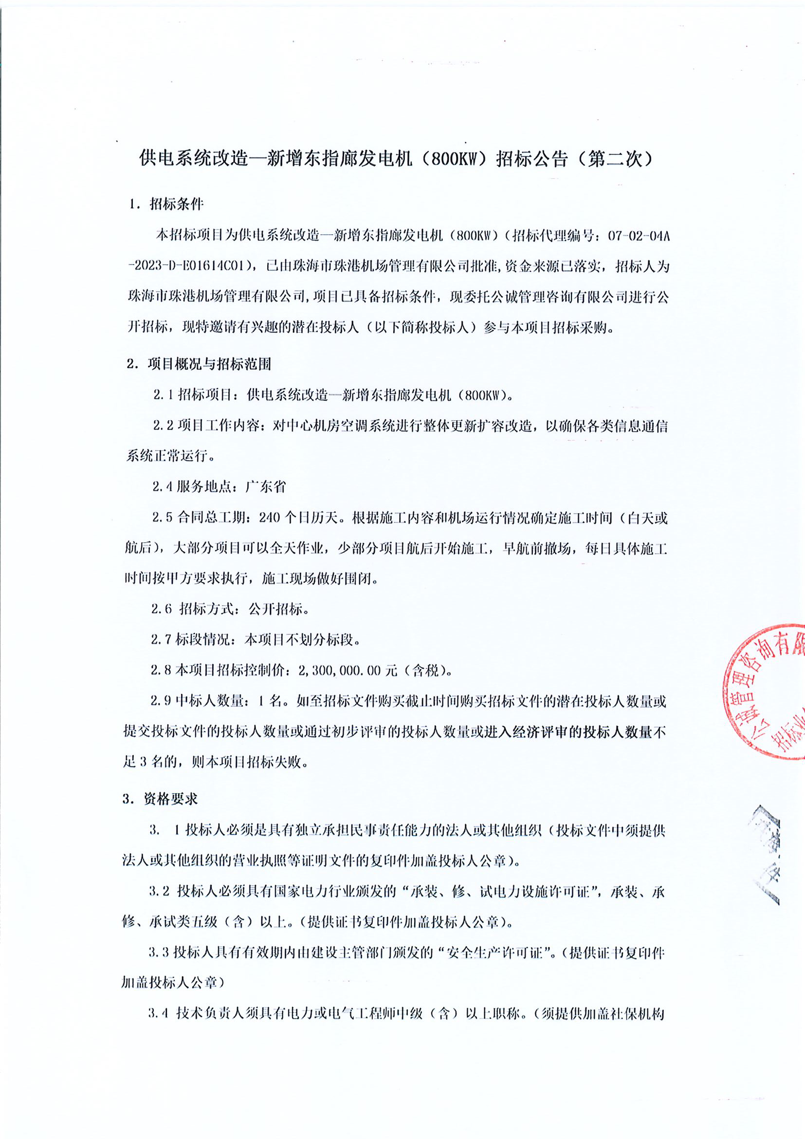 供电系统改造—新增东指廊发电机(800KW)招标公告(第二次)