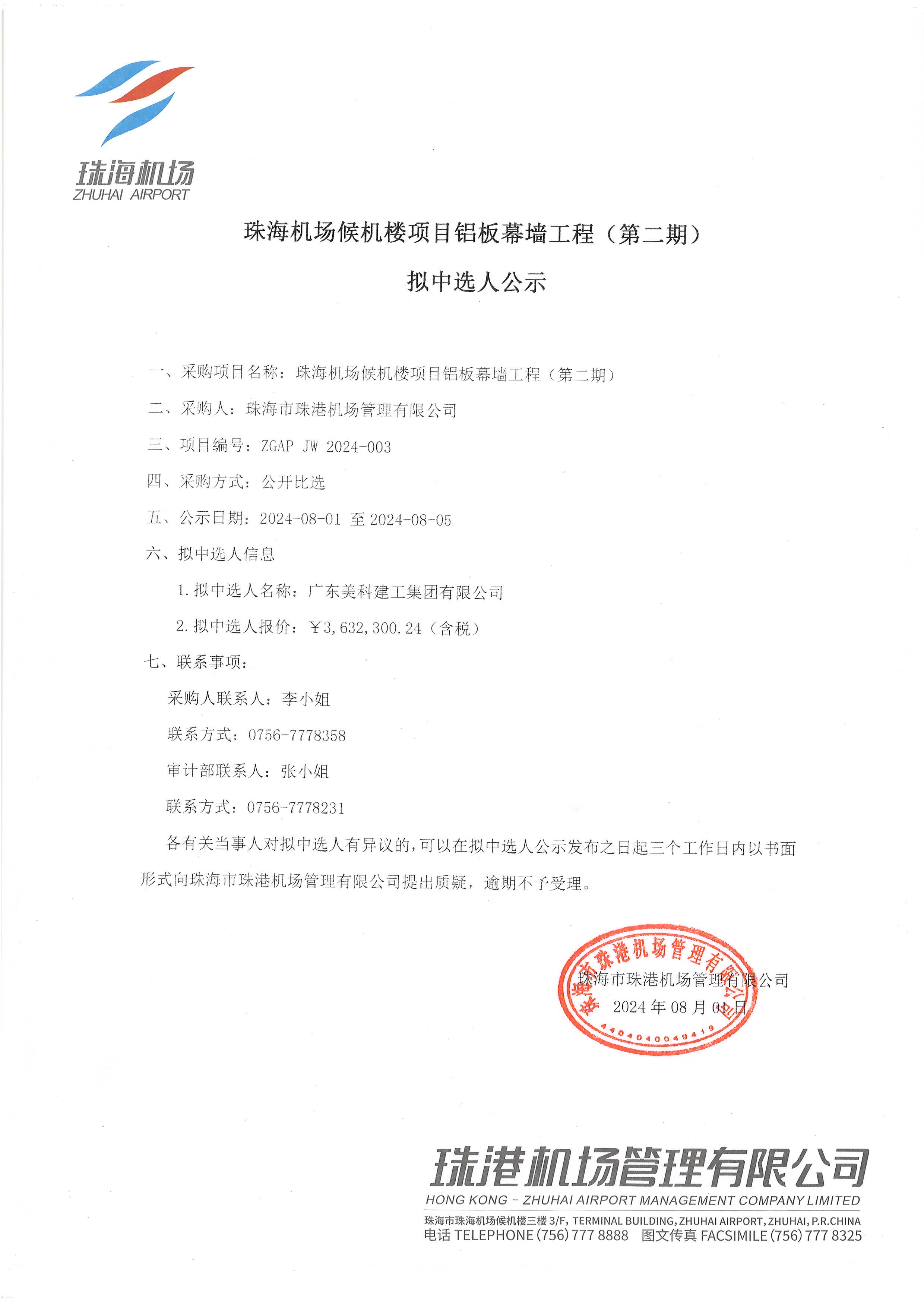 珠海机场候机楼项目铝板幕墙工程(第二期)拟中选人公示