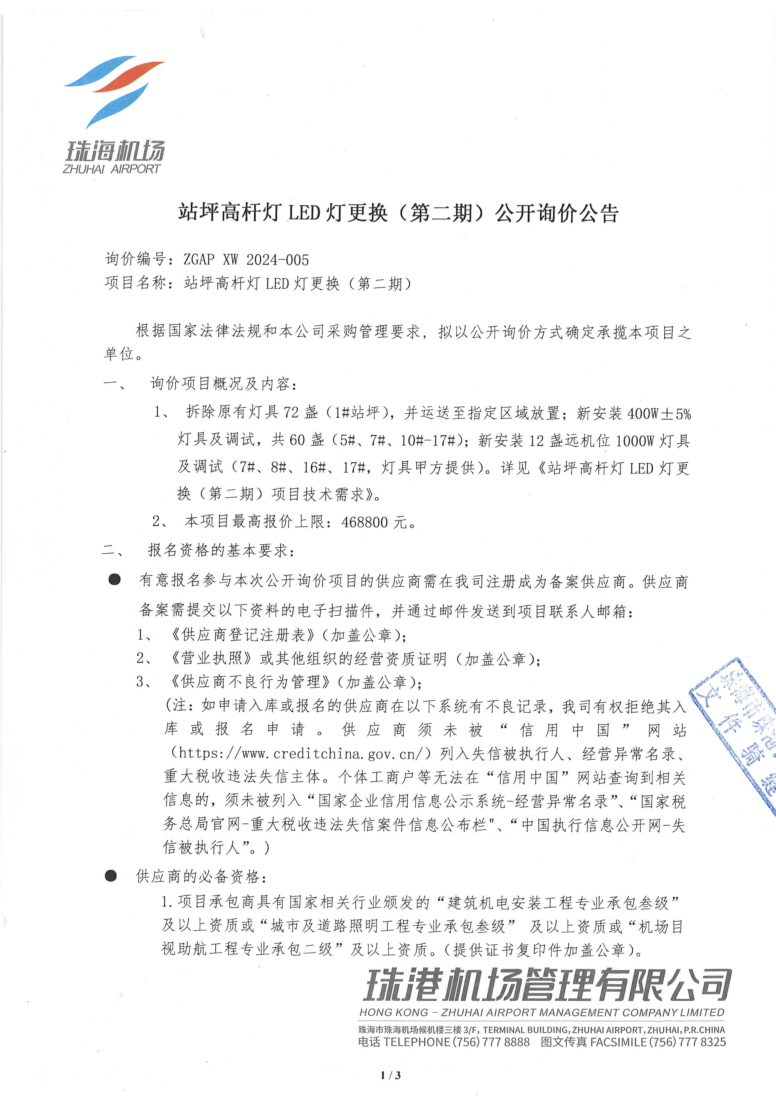 站坪高杆灯LED灯更换(第二期)公开询价公告