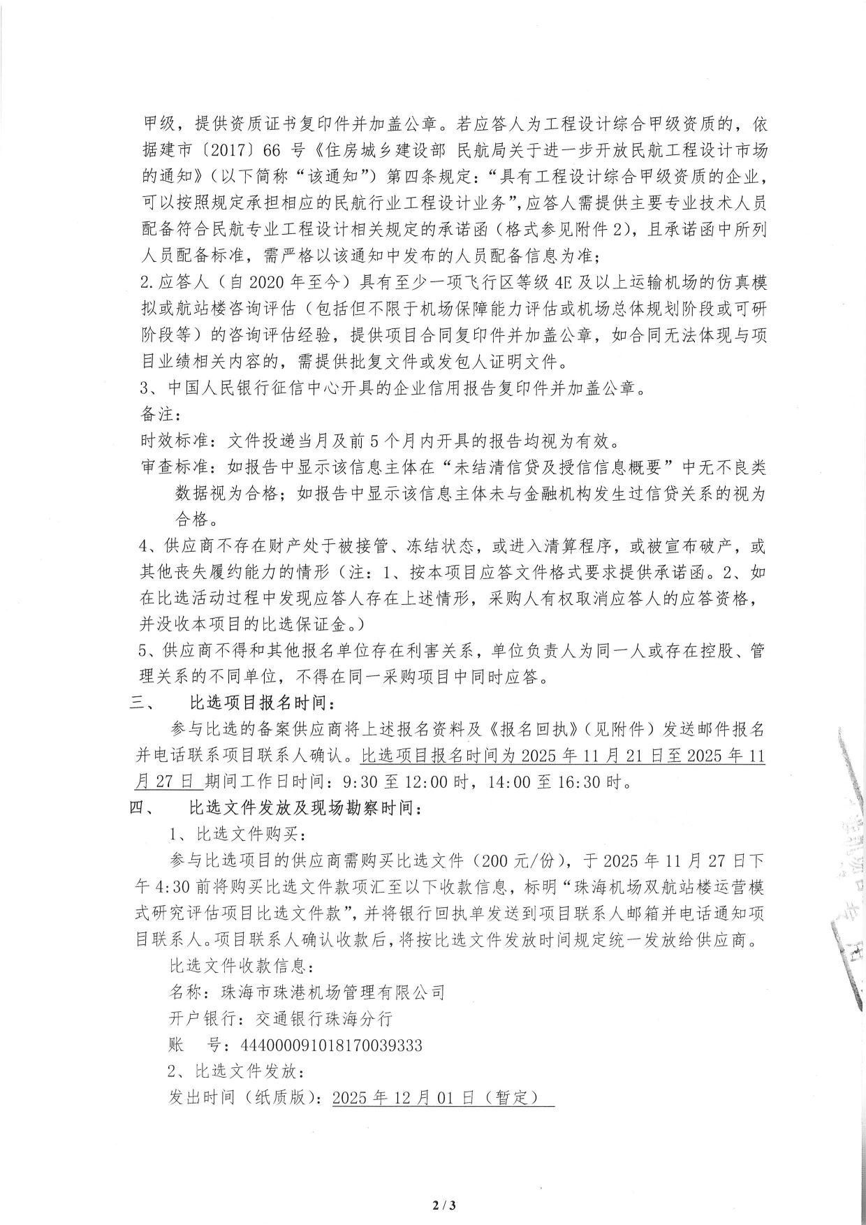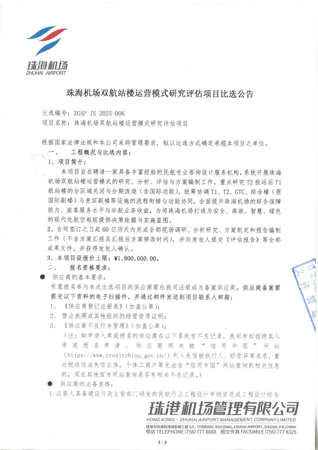 珠海机场双航站楼运营模式研究评估项目比选公告