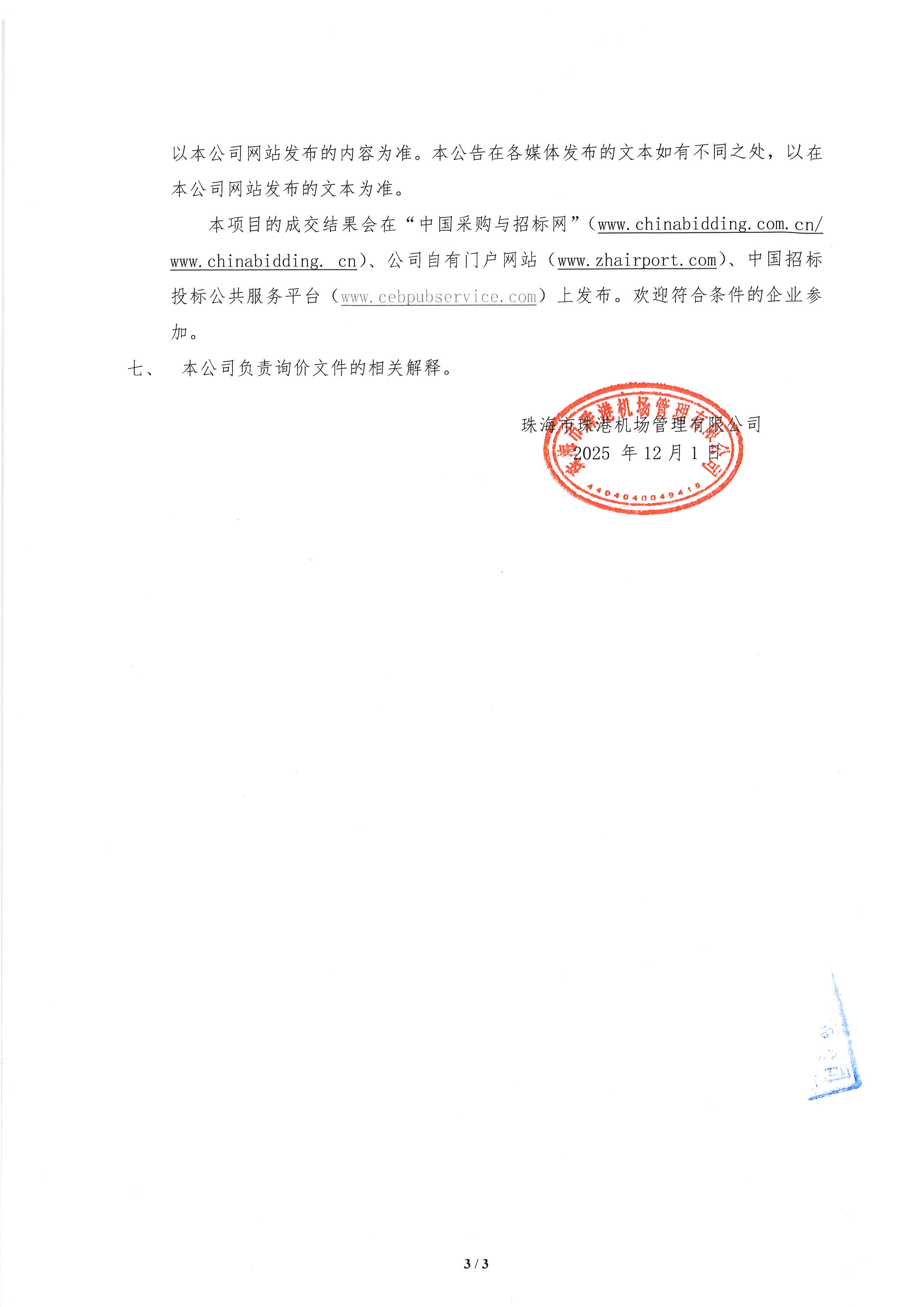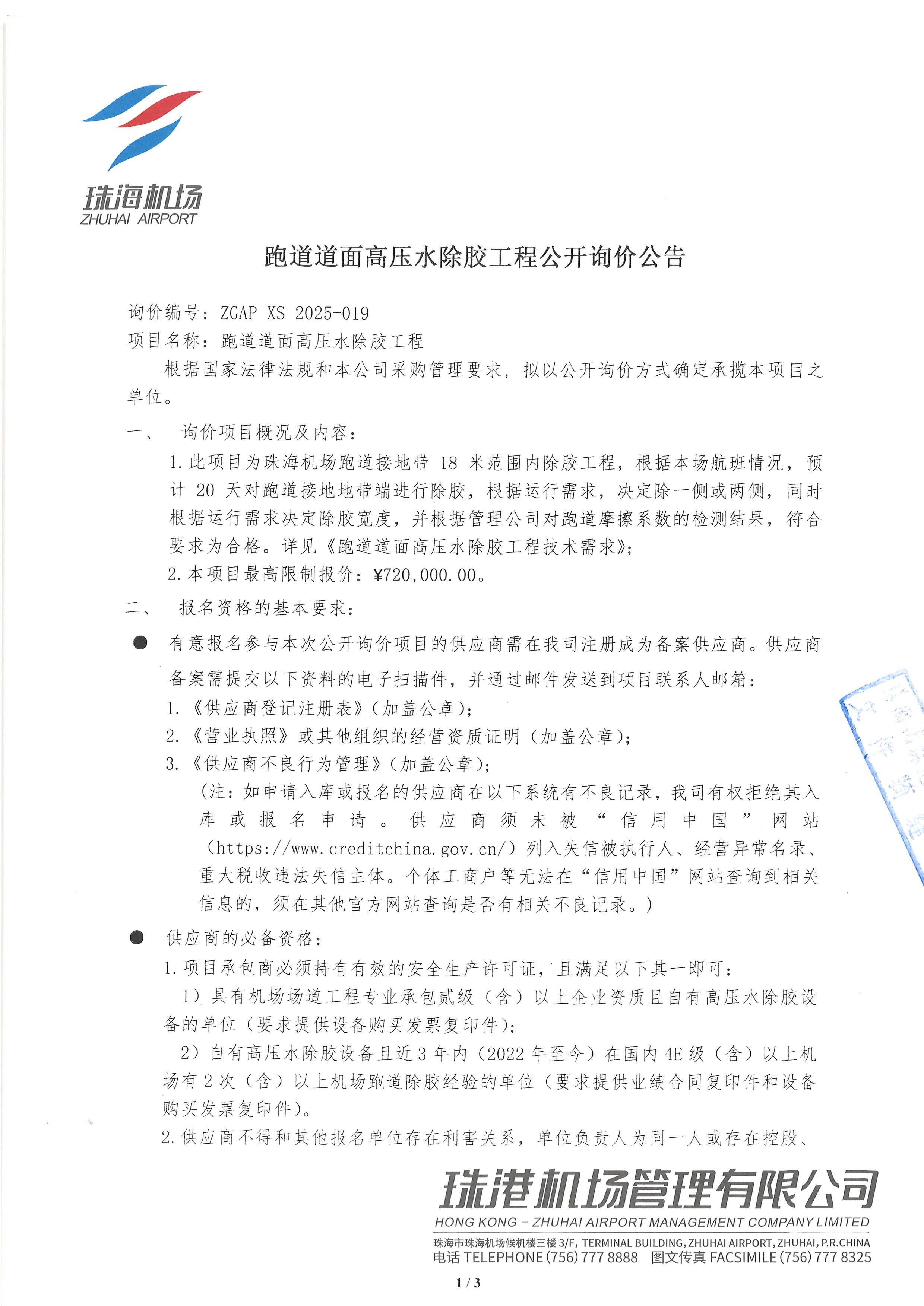 跑道道面高压水除胶工程公开询价公告