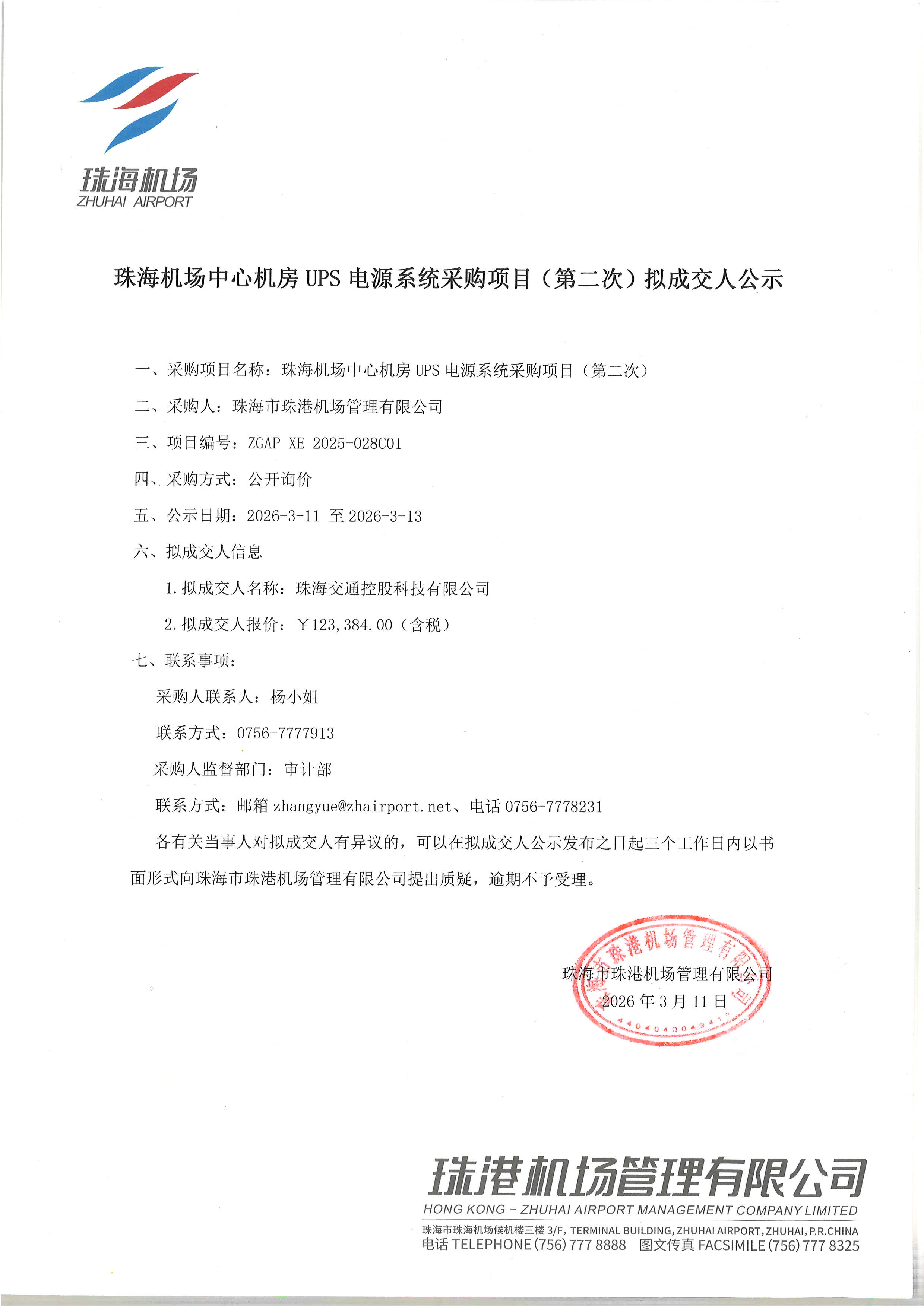 珠海机场中心机房UPS电源系统采购项目(第二次)拟成交人公示