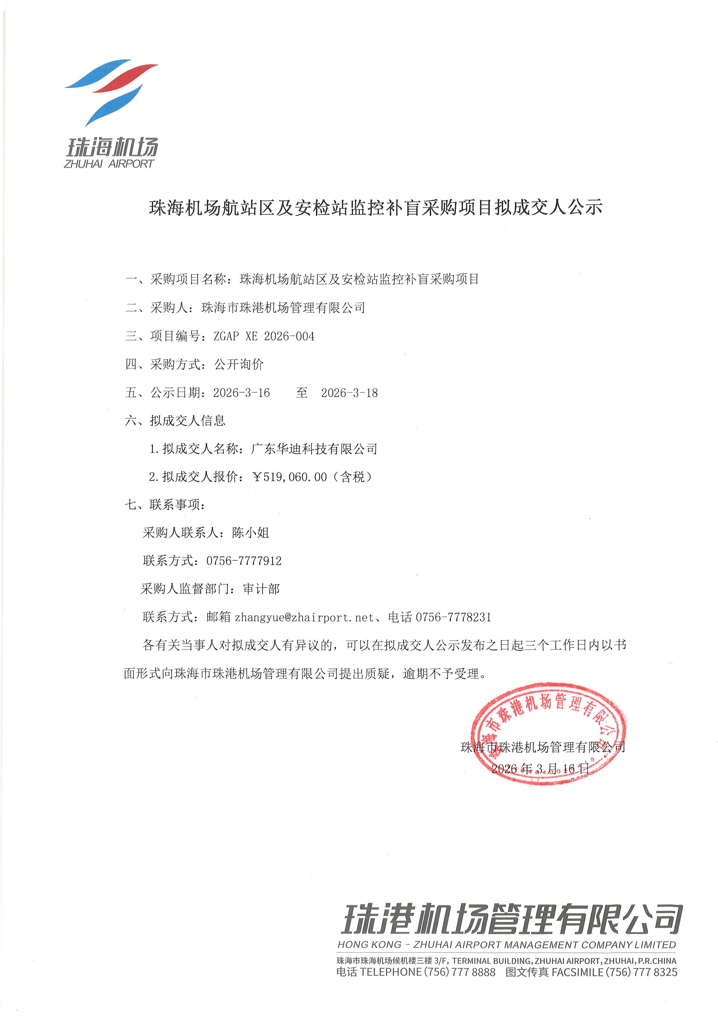 珠海机场航站区及安检站监控补盲采购项目拟成交人公示