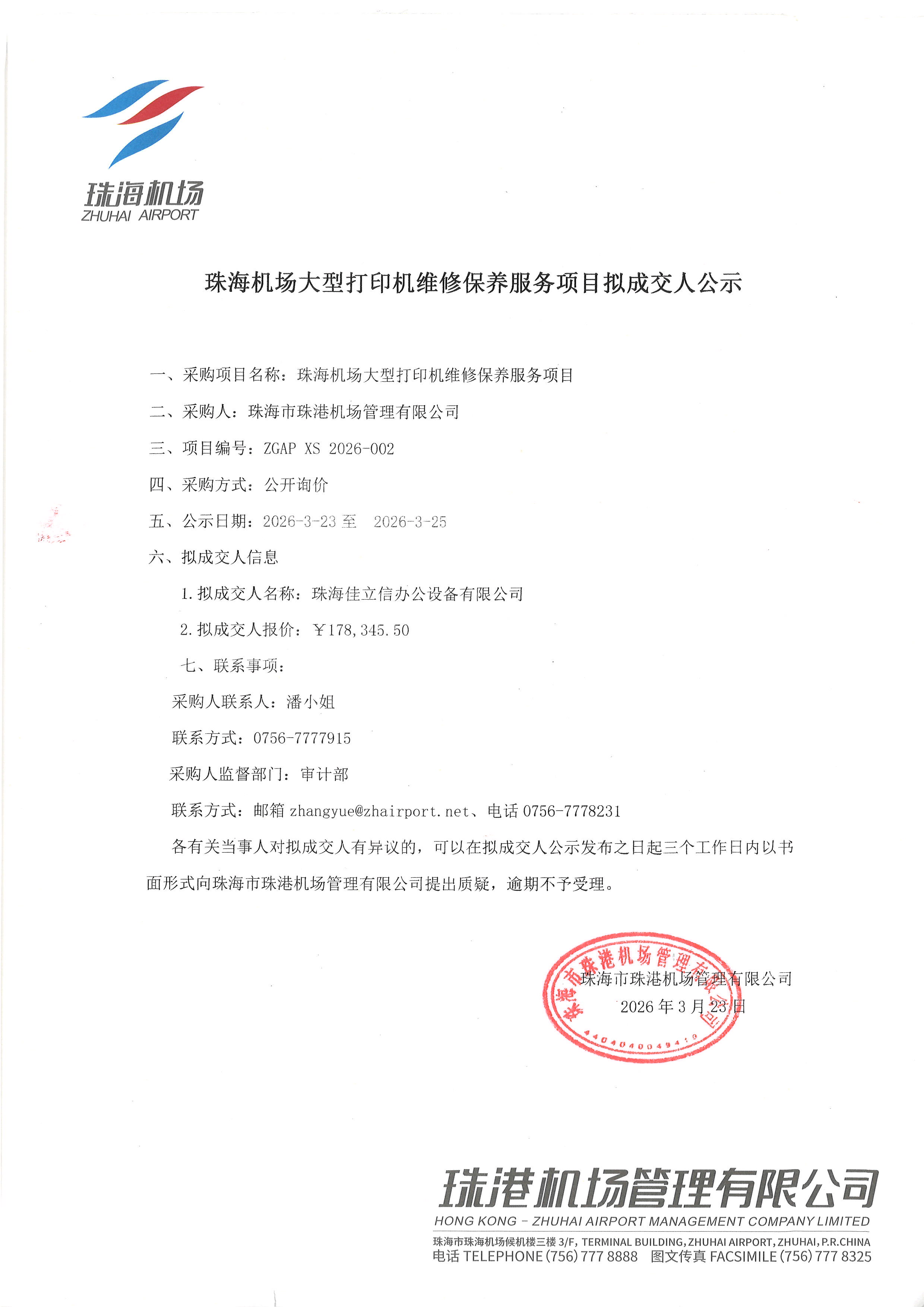 珠海机场大型打印机维修保养服务项目拟成交人公示