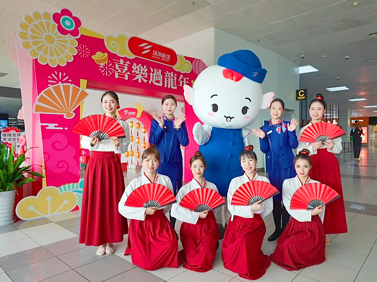 为提升旅客出行体验,珠海机场积极践行“真情服务”理念,在候机楼内增设“春运引导员”及“志愿服务岗”,增加服务引导人员,在托运行李、安检答疑、交通指引等方面为旅客提供帮助;聚焦旅客乘机出行需求,加强对老年人、无成人陪伴儿童等特殊旅客的关爱服务和全流程引导,为旅客提供“有温度、有年味”的真情服务。同时,对航站楼进行精心地节庆布置,悬挂灯笼、张贴福字,使得旅客在各个角落都能感受到浓厚的新年气息,并开展“喜乐过龙年”旅客体验活动,通过游戏互动、吉祥物巡游、舞蹈快闪表演、DIY手作、馈赠礼品等形式,为旅客送去新春祝福。